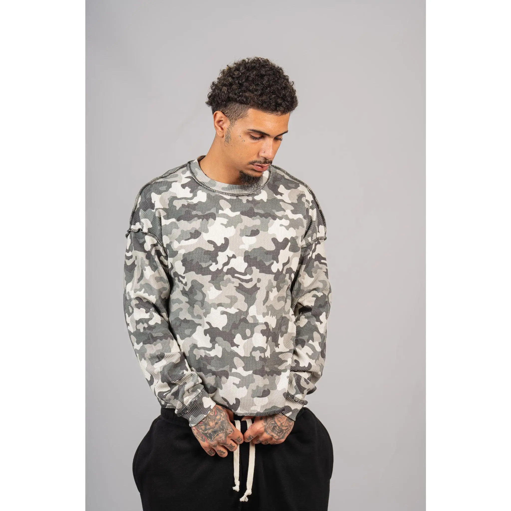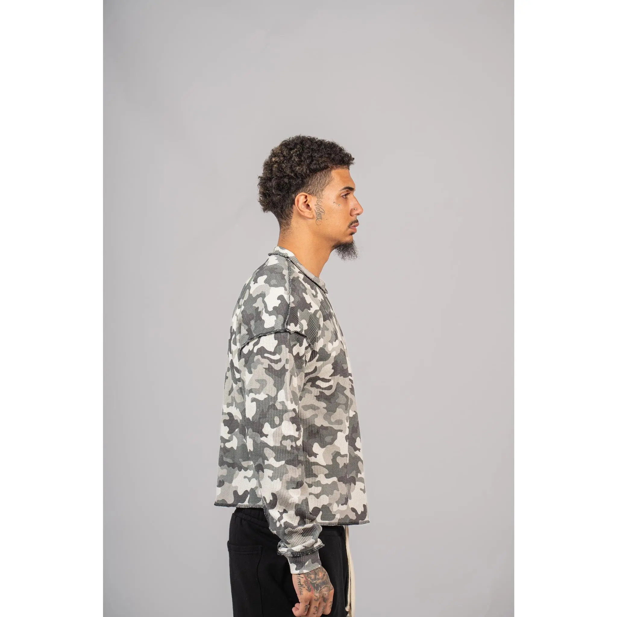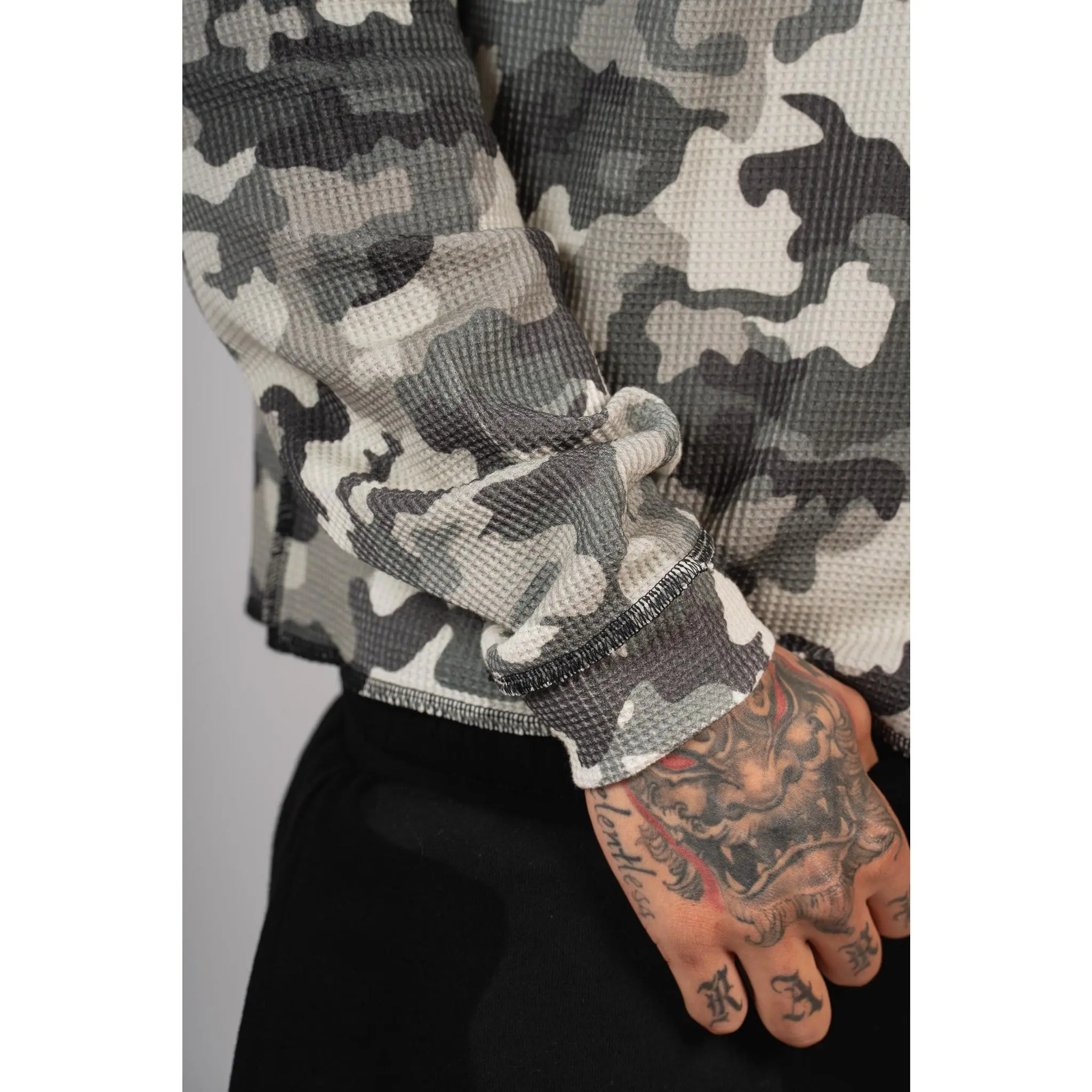 Premium waffle-knit thermal with all-over camo, exposed seam detailing, and a slightly cropped boxy fit. Pre-washed for a soft vintage feel with just the right edge.