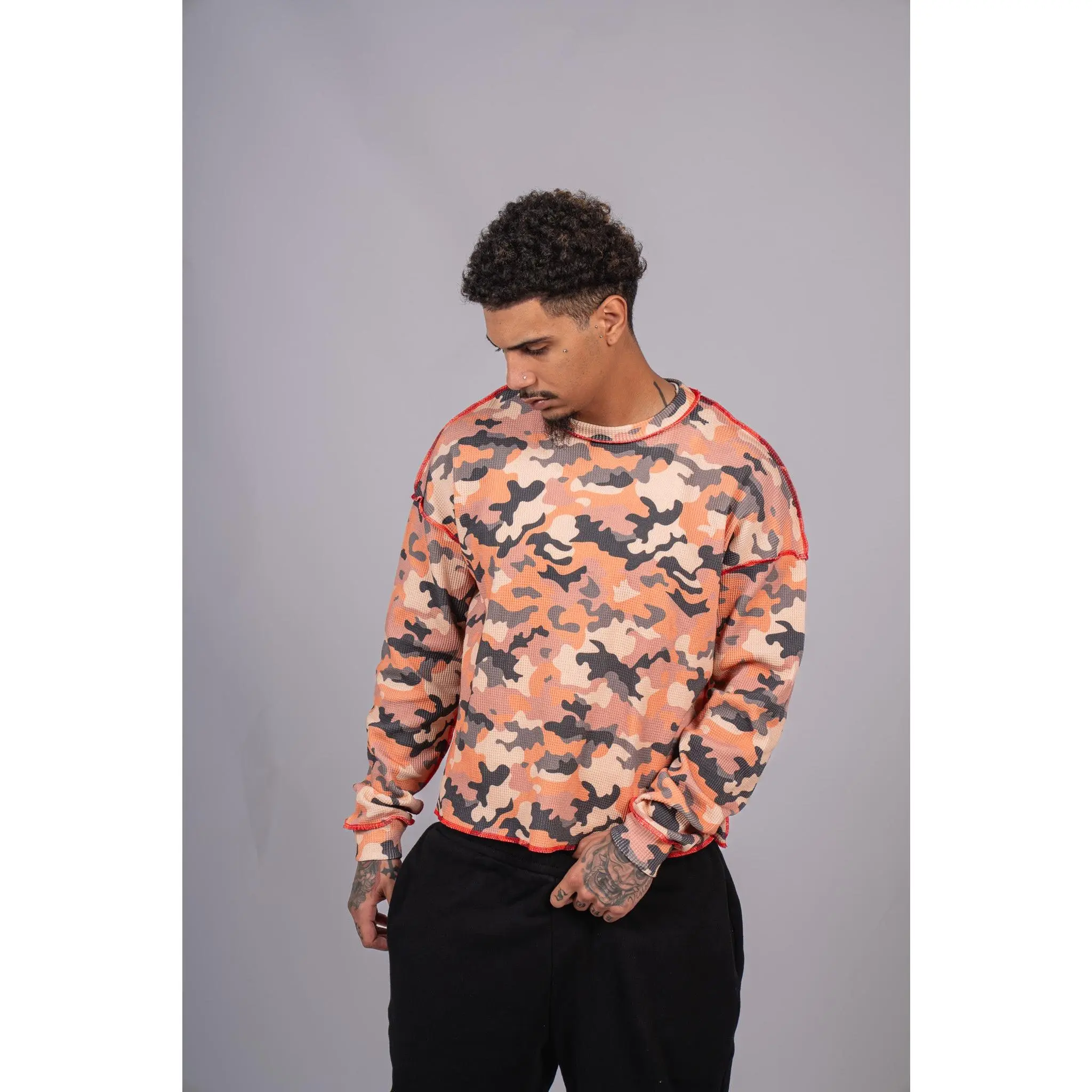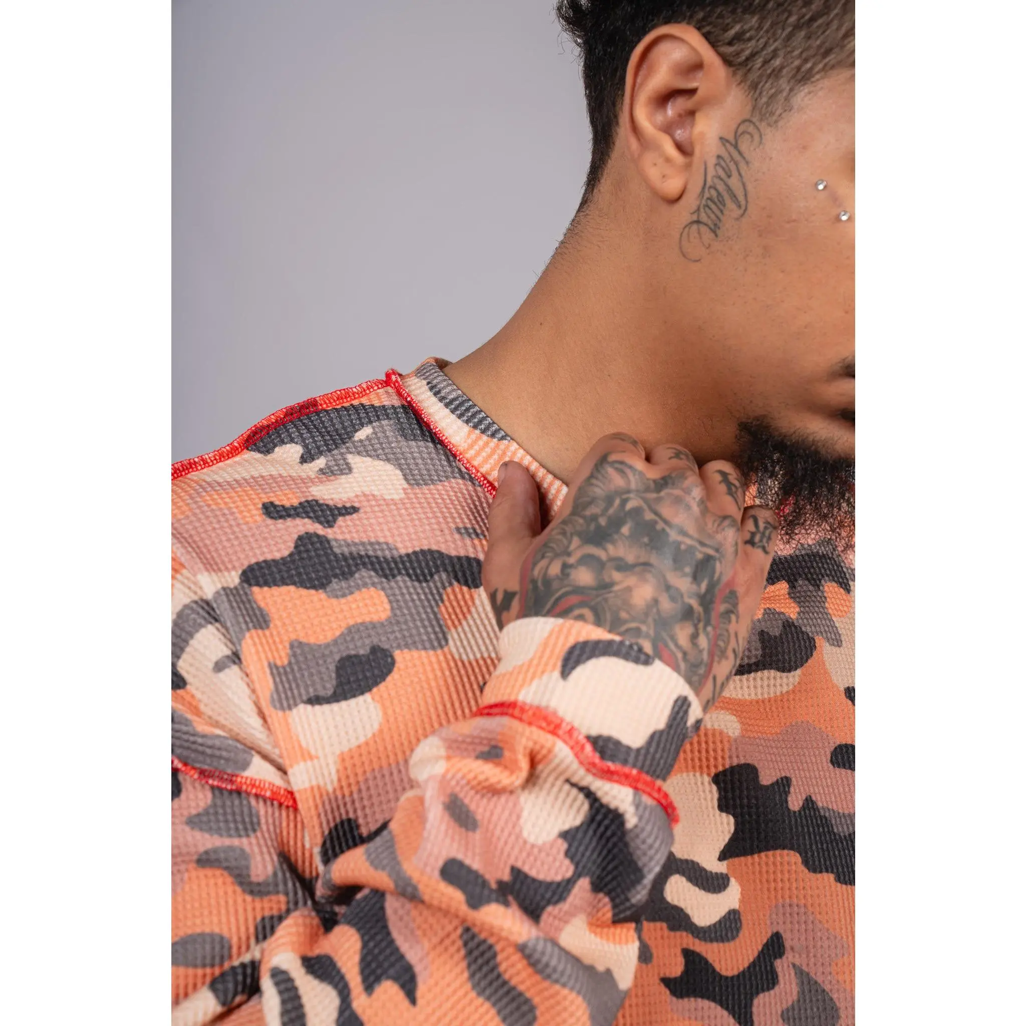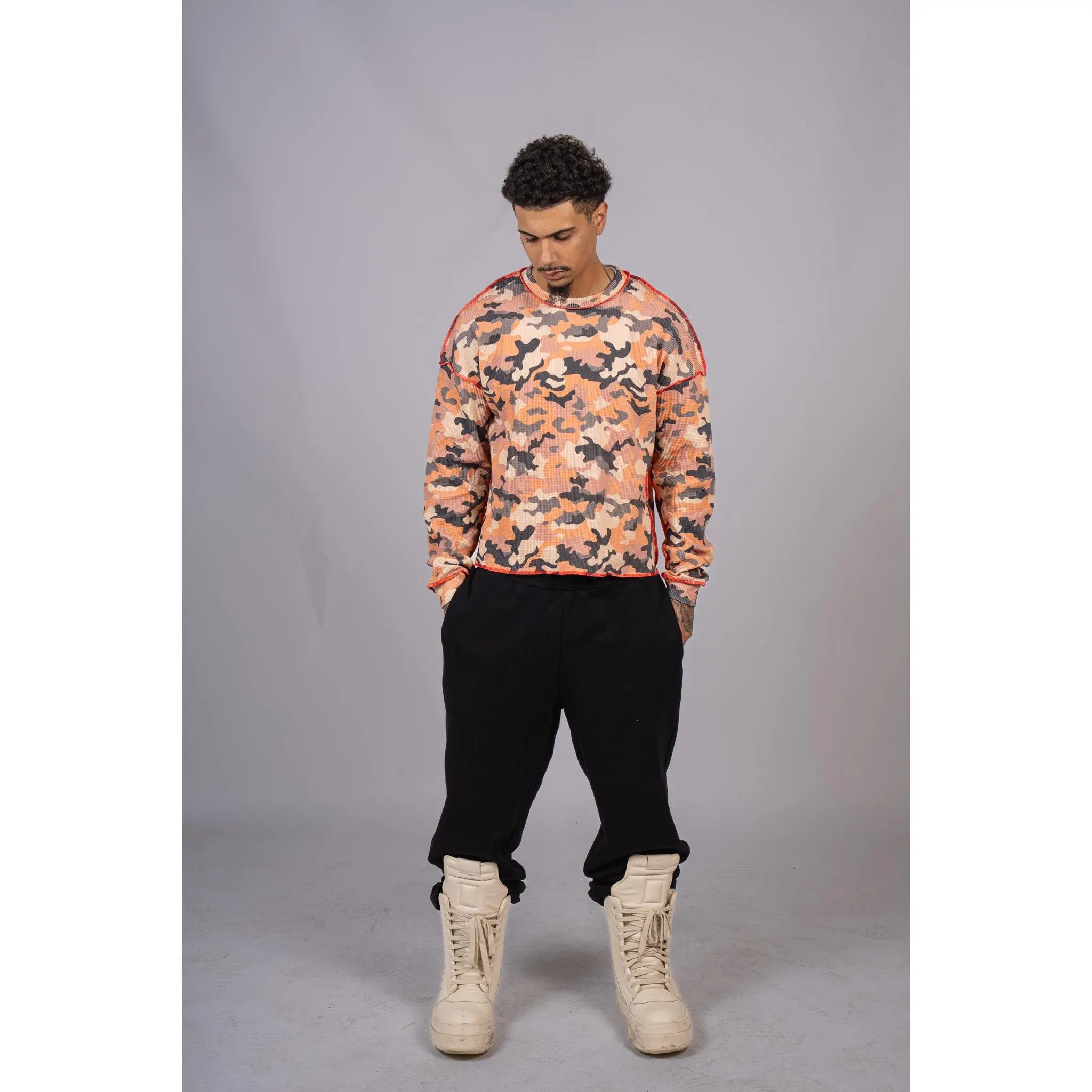Premium waffle-knit thermal with all-over camo, exposed seam detailing, and a slightly cropped boxy fit. Pre-washed for a soft vintage feel with just the right edge.