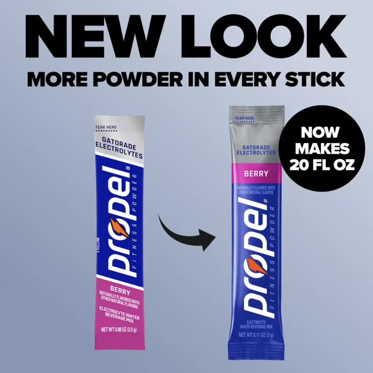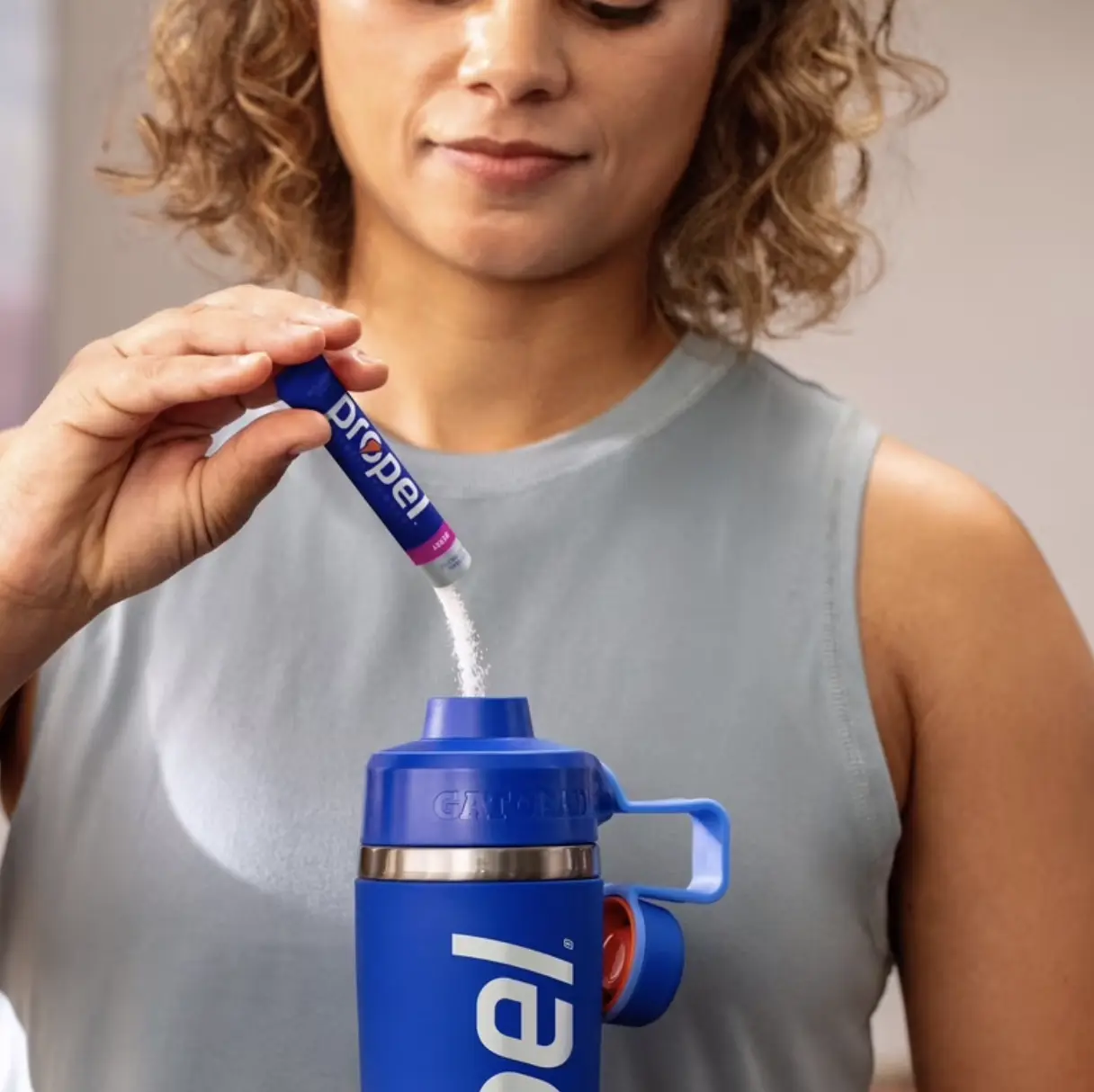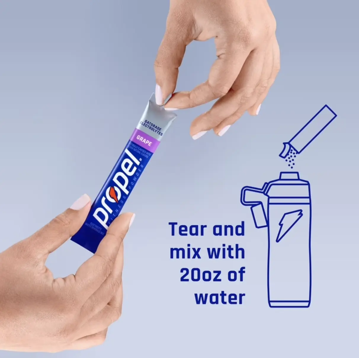 Propel is fortified with B Vitamins and antioxidants (Vitamins C & E). It helps replace lost electrolytes with zero sugar and only 5 calories per serving. Flavor your water without guilt. Just toss a stick into your water bottle. #ZeroSugar #Hydration #WorkoutEssentials