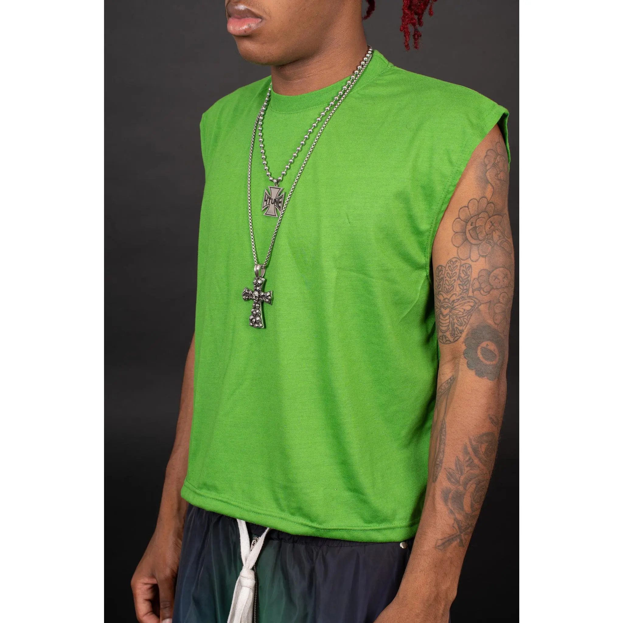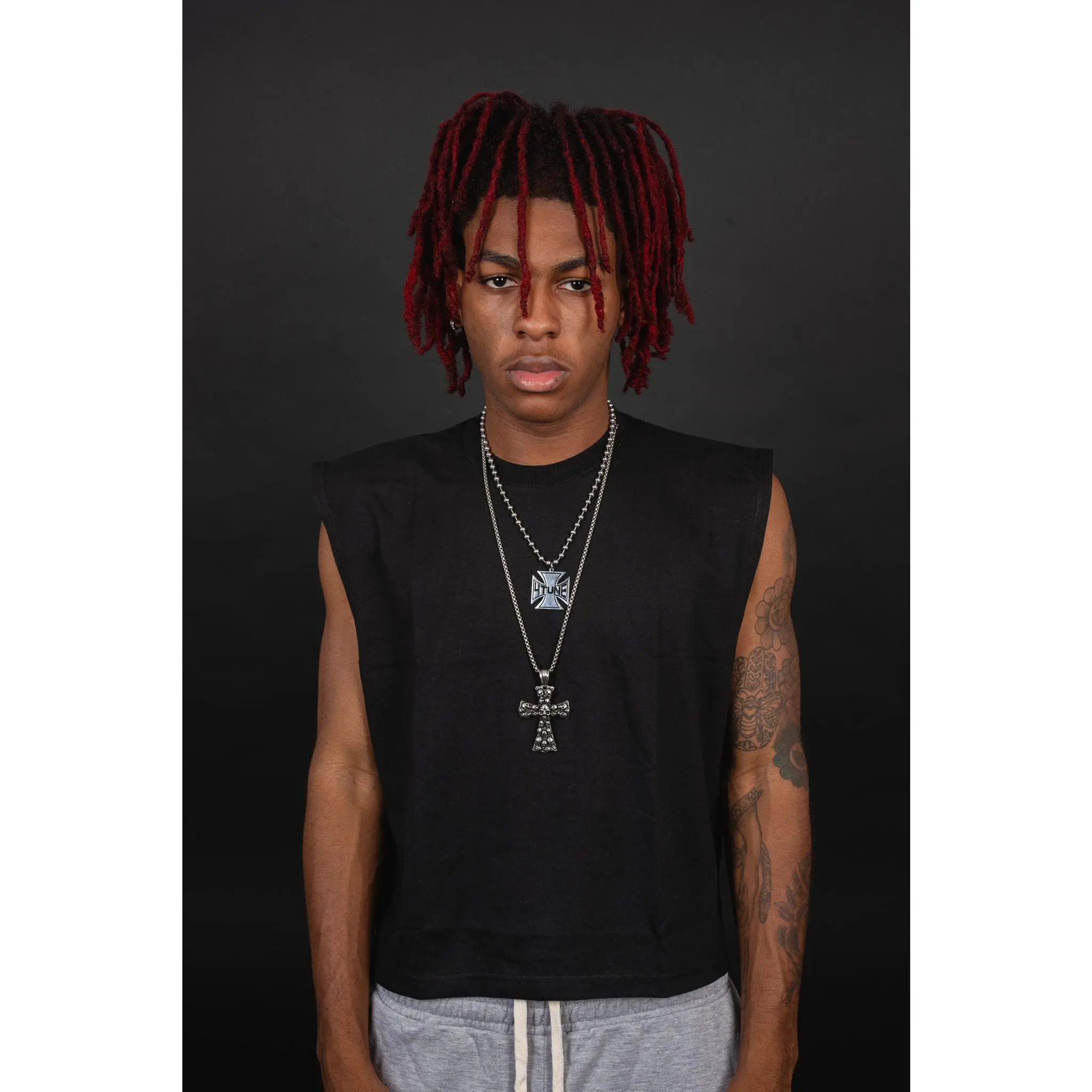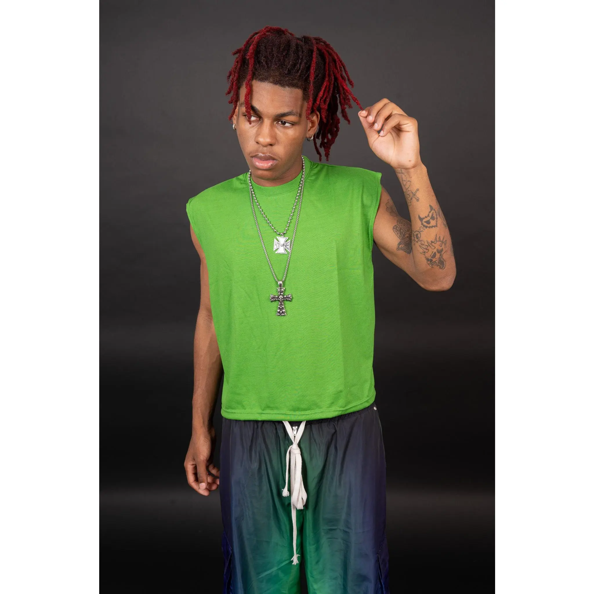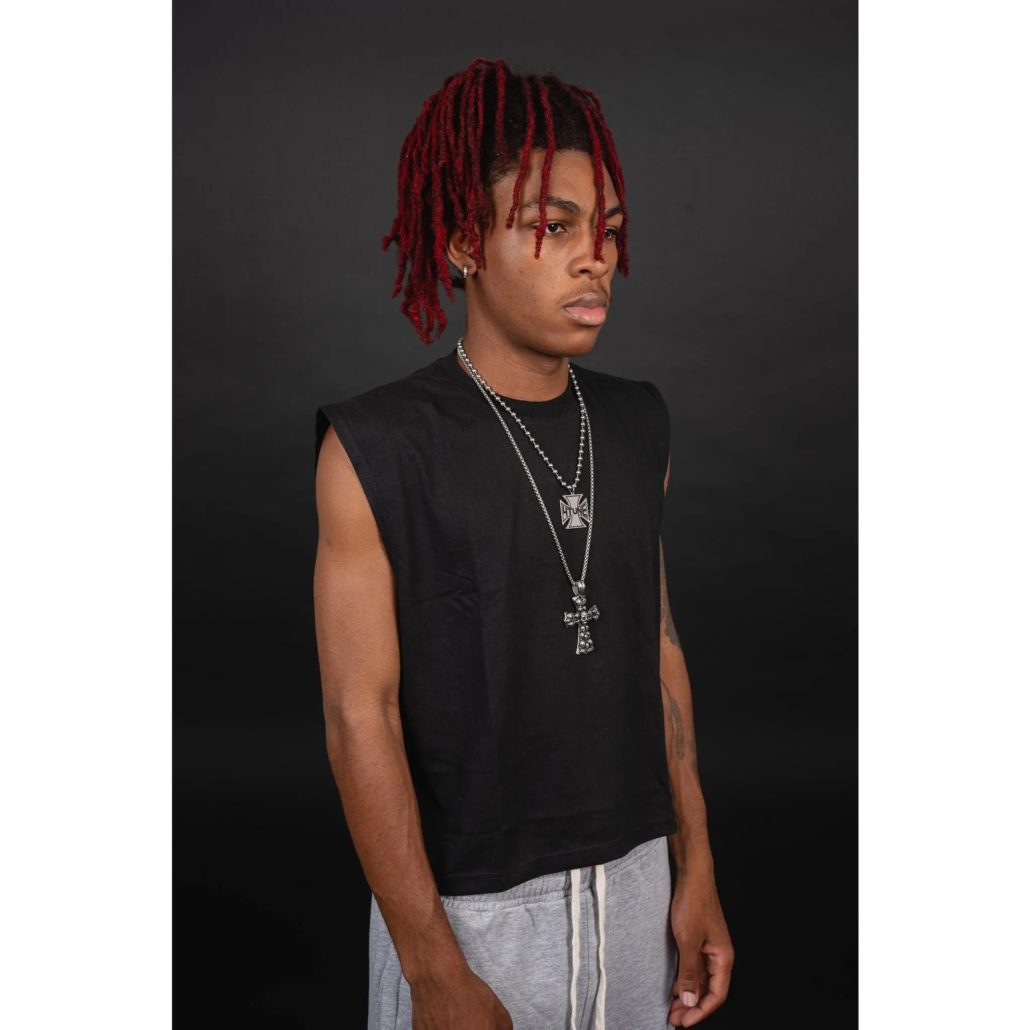 Loose-fitting sleeveless T-shirt with a round neckline.
