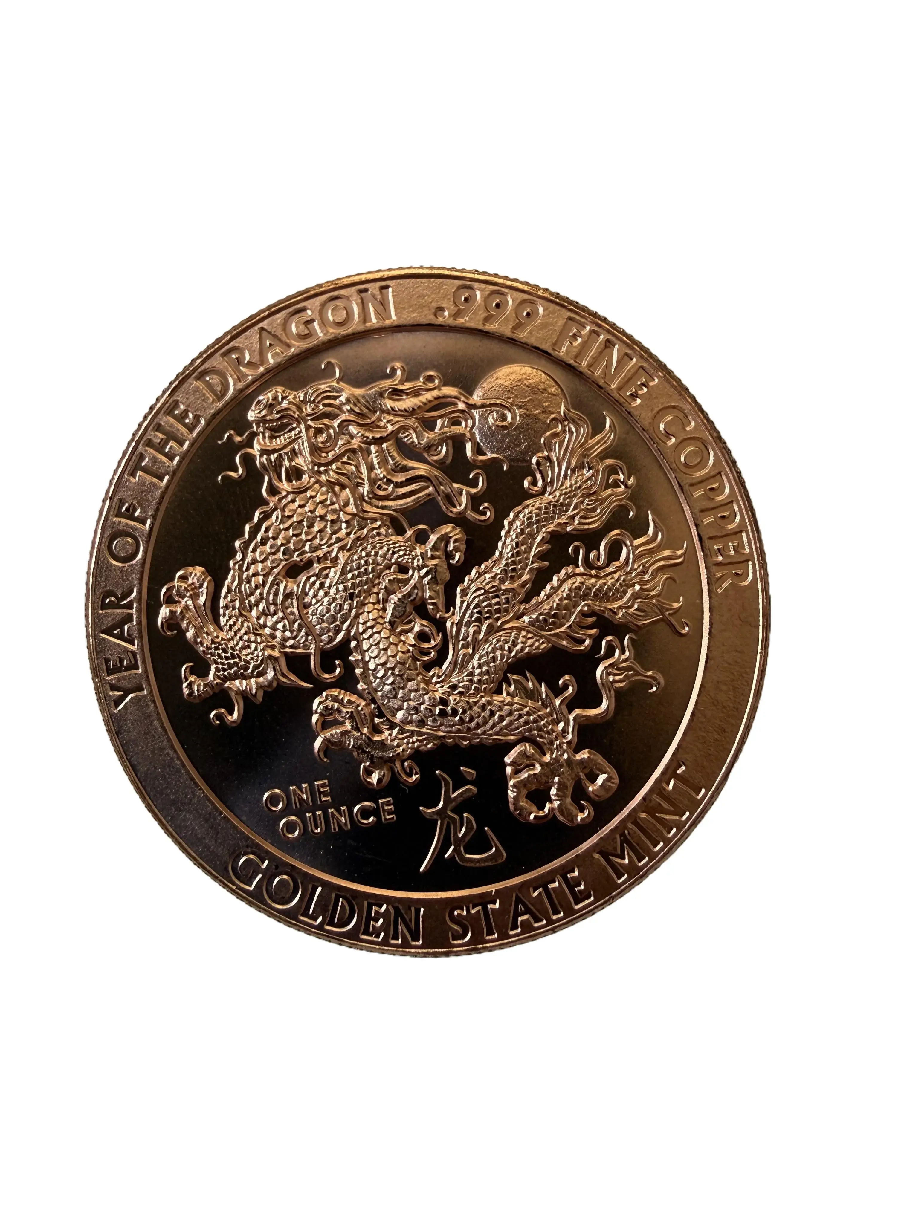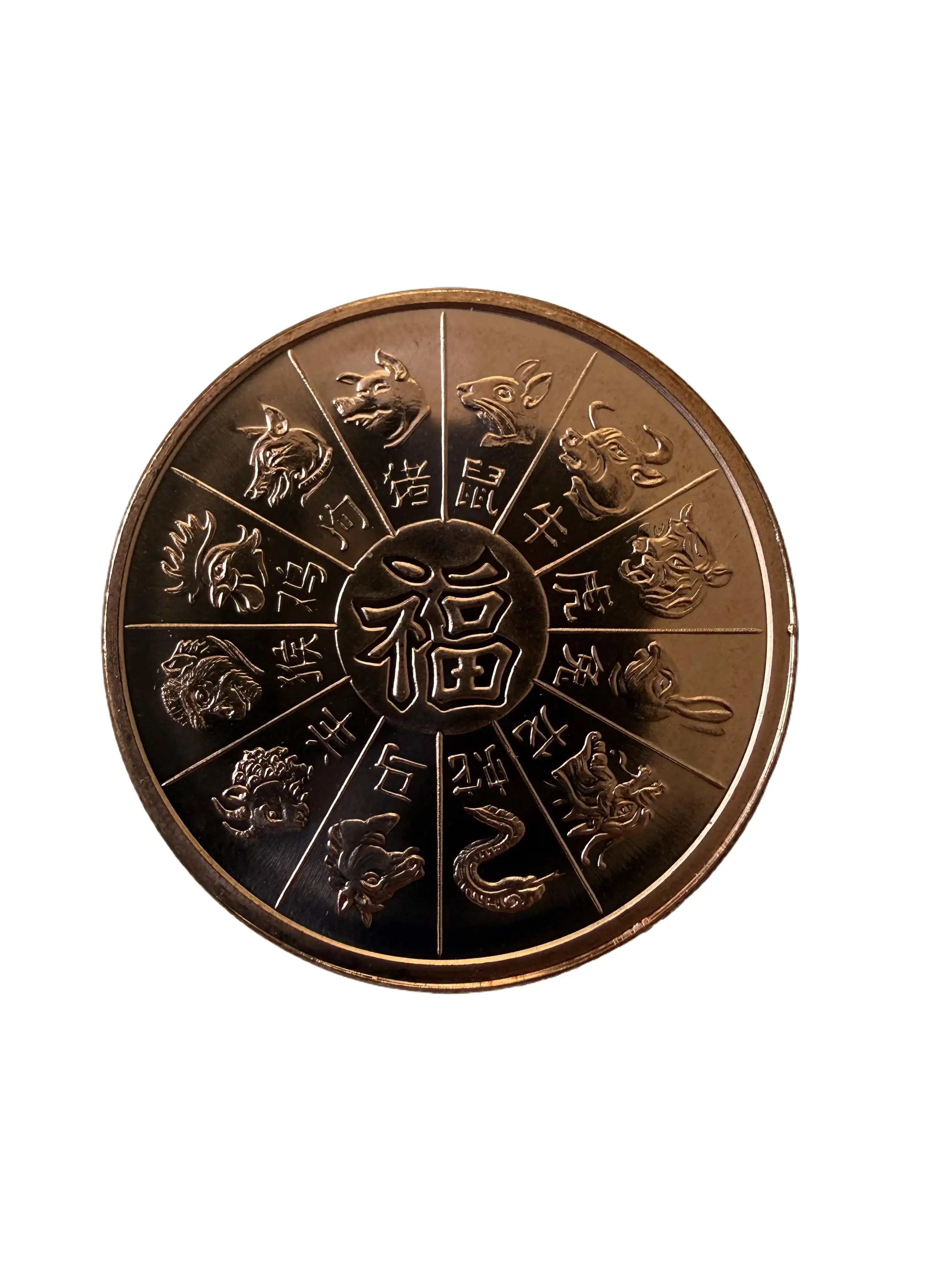 Copper round featuring the Chinese Zodiac — one side displays all 12 zodiac animals surrounding the Chinese "" (Fu/Fortune) character, while the reverse showcases a detailed Year of the Dragon design. A perfect Chinese New Year celebrations gift.