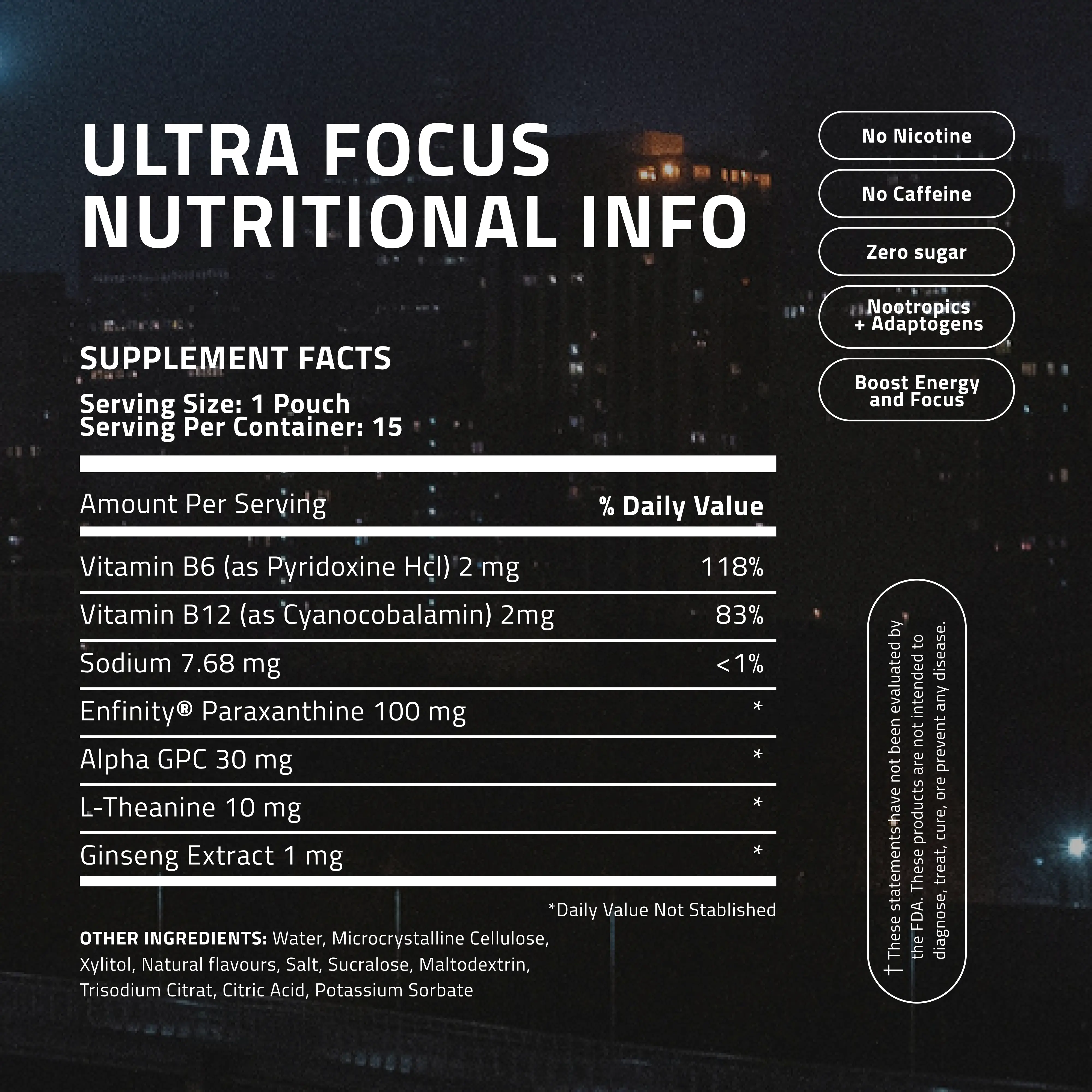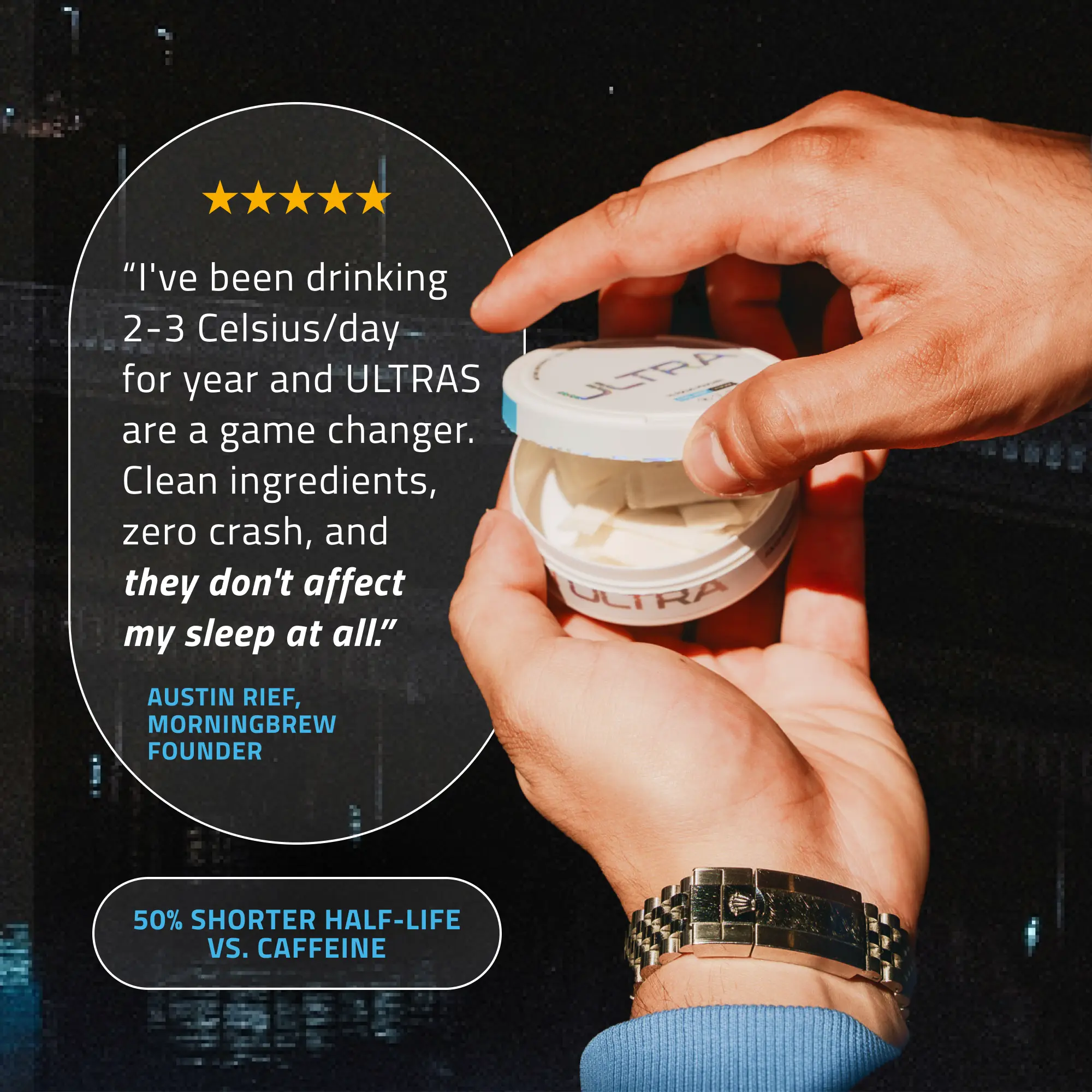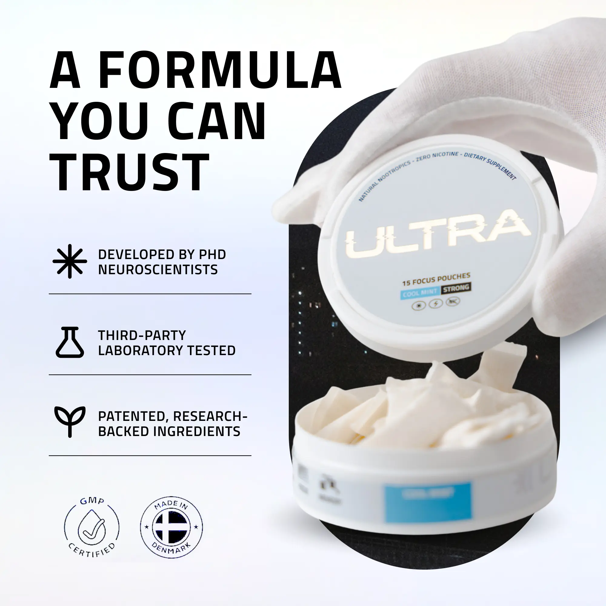 Oh yeah! Nicotine pouches can damage your gums, cause vasoconstriction and disrupt your hormones. So if you're using nicotine pouches for a focus or energy boost, you need to try Ultra. Zero nicotine, zero caffeine, with research-grade ingredients designed for clean energy + focus, and in 5 amazing flavors. It's the ultimate guilt-free pouch!