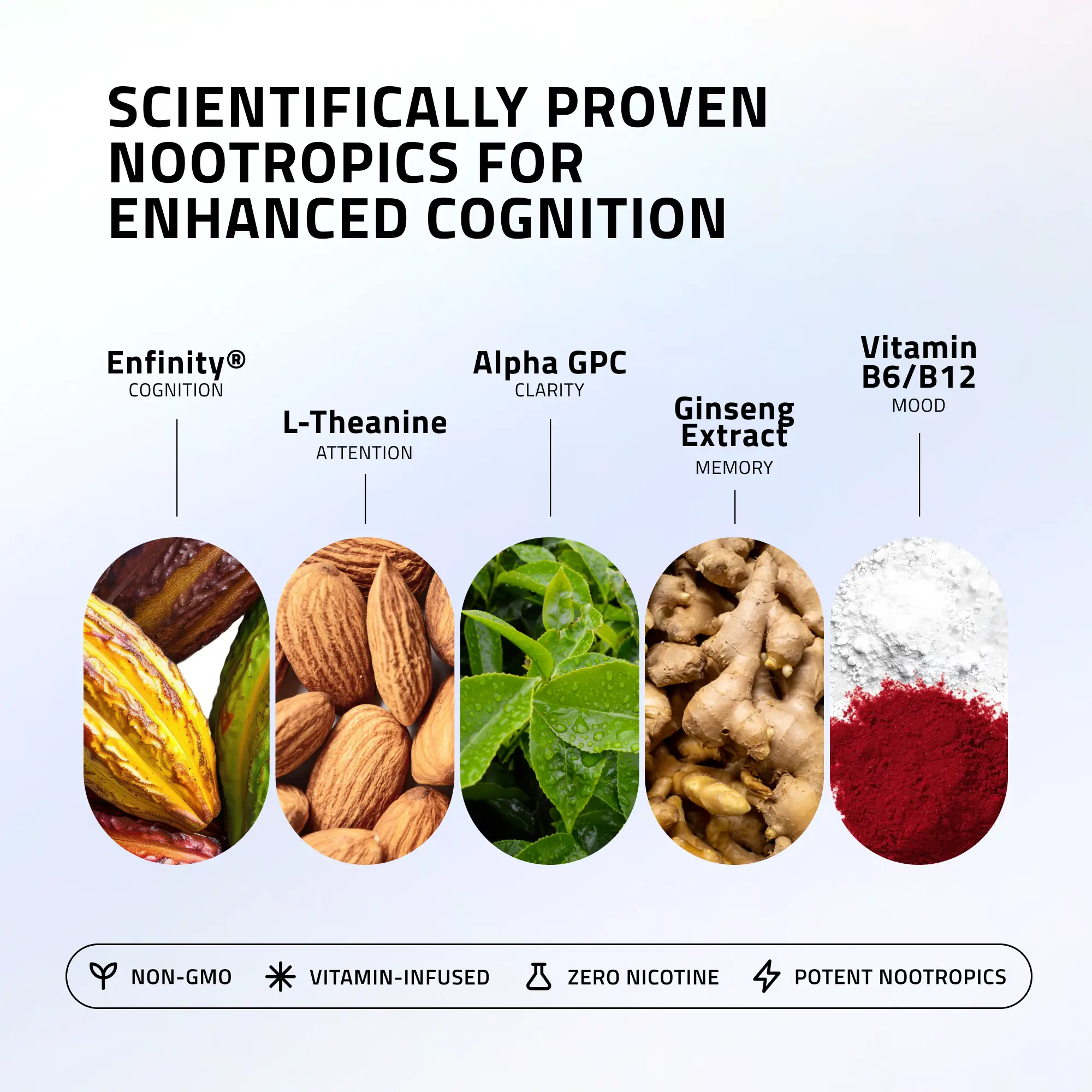 Instant focus in a pouch. A next generation tool to reclaim control of your focus and energy. Crafted with a potent blend of 6 clean, clinically-proven nootropics & adaptogens. Designed to clear brain fog, boost cognition, enhance memory recall, and suppress your appetite, without the baggage of nicotine, caffeine, sugar or heavy stimulants.