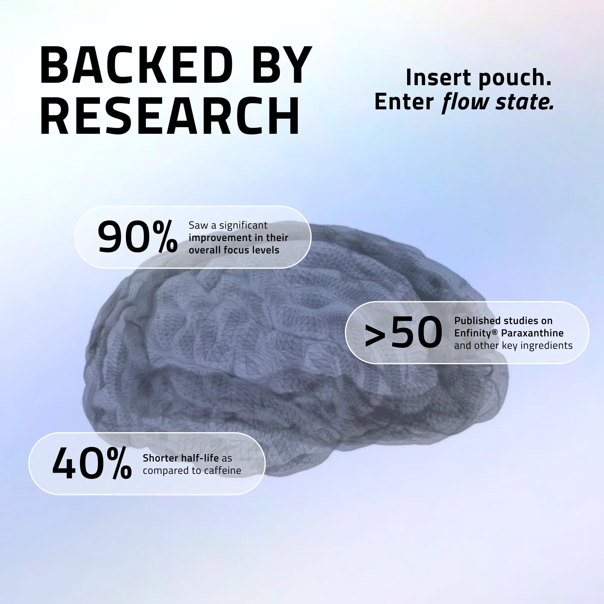 We've partnered with leading neuroscience researchers to design a first-of-its-kind delivery mechanism for our clinically validated nootropic formula. The result? The world's first Focus Pouch, a brilliant innovation delivering performance in a pouch.