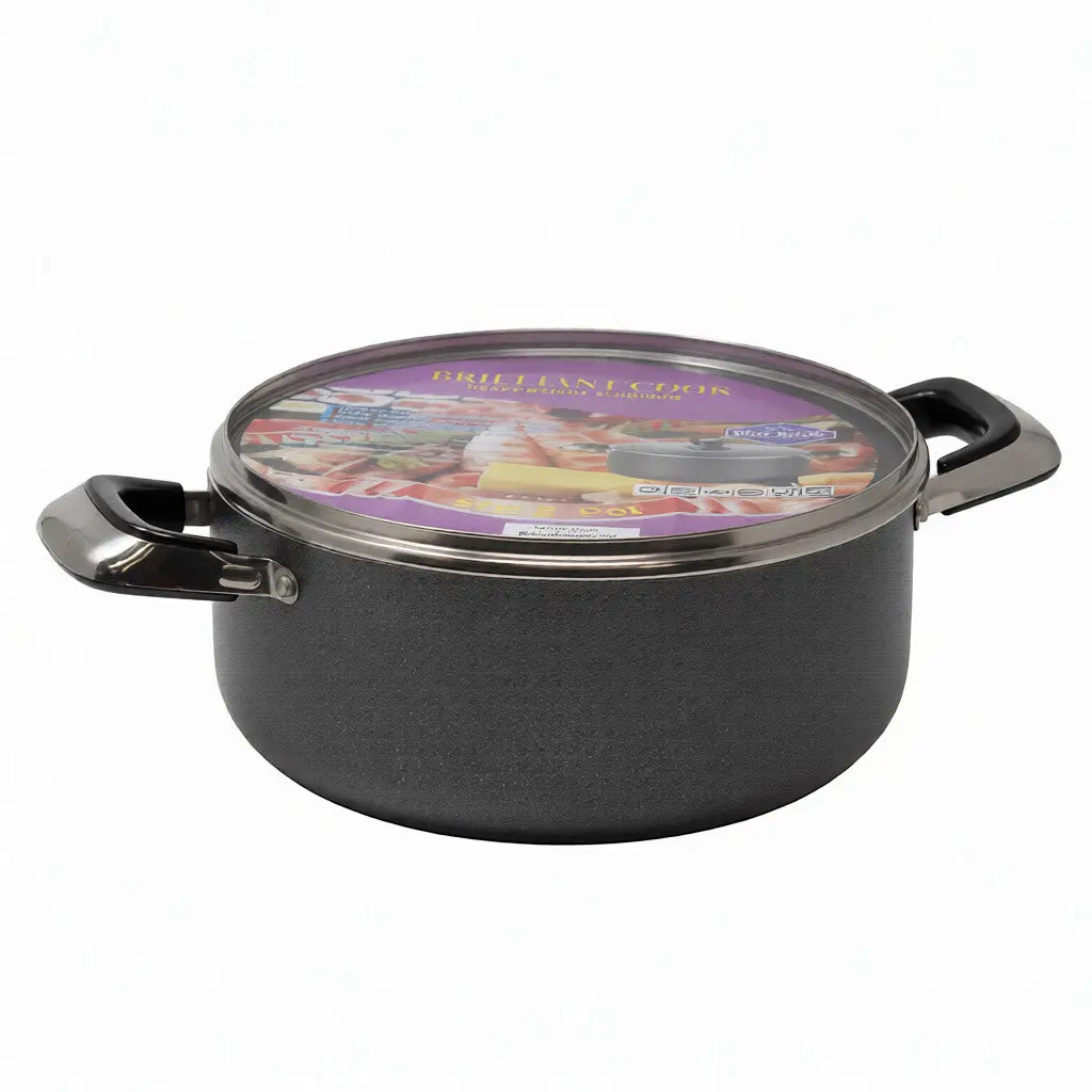 Heavy gauge aluminum body High quality non-stick interior Heat tempered glass cover Stay cool bakelite handle Size 5Qt
