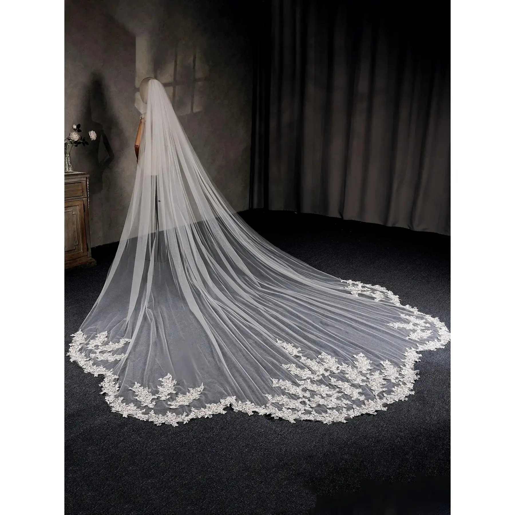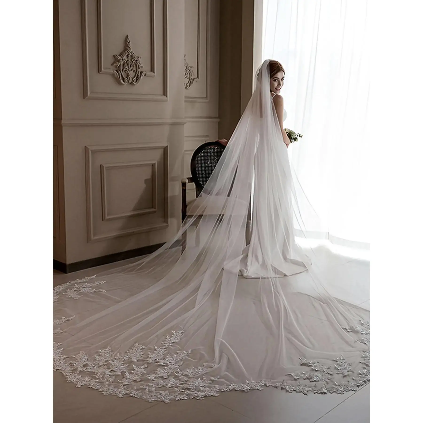 Bridal Cathedral Veil in Delicate White Lace with Oversized Train and Romantic Wavy Edges Wedding Photo Essential Trailing Veil