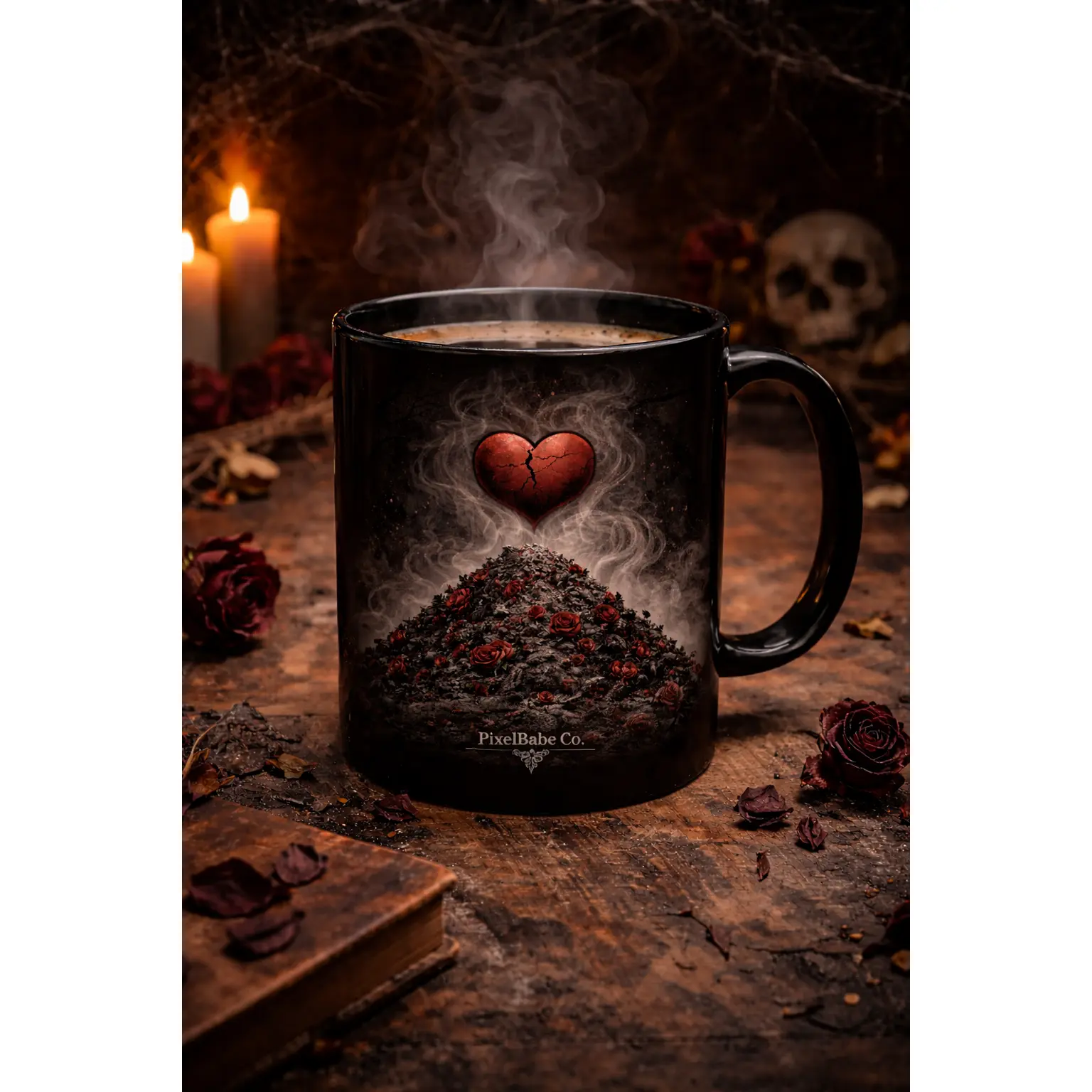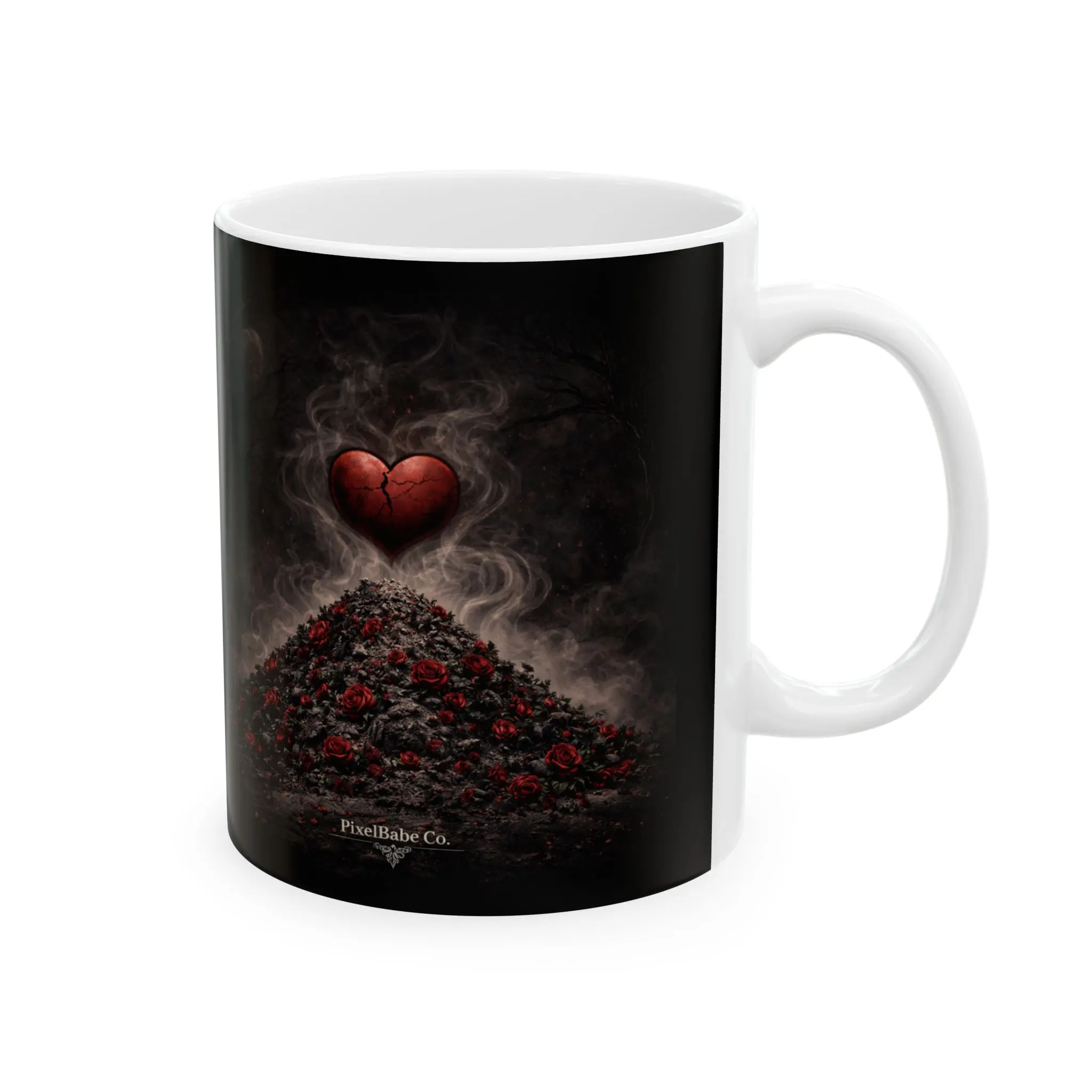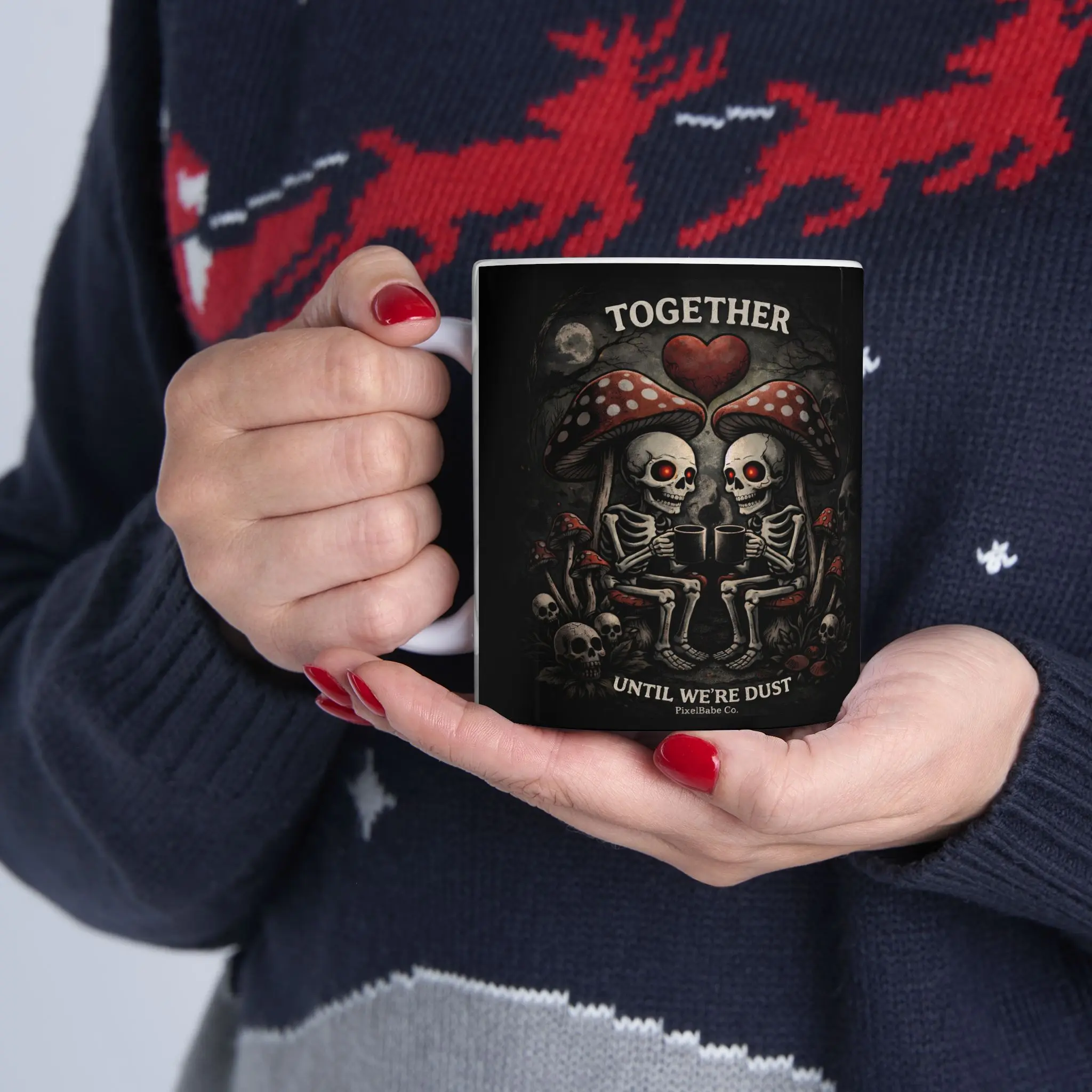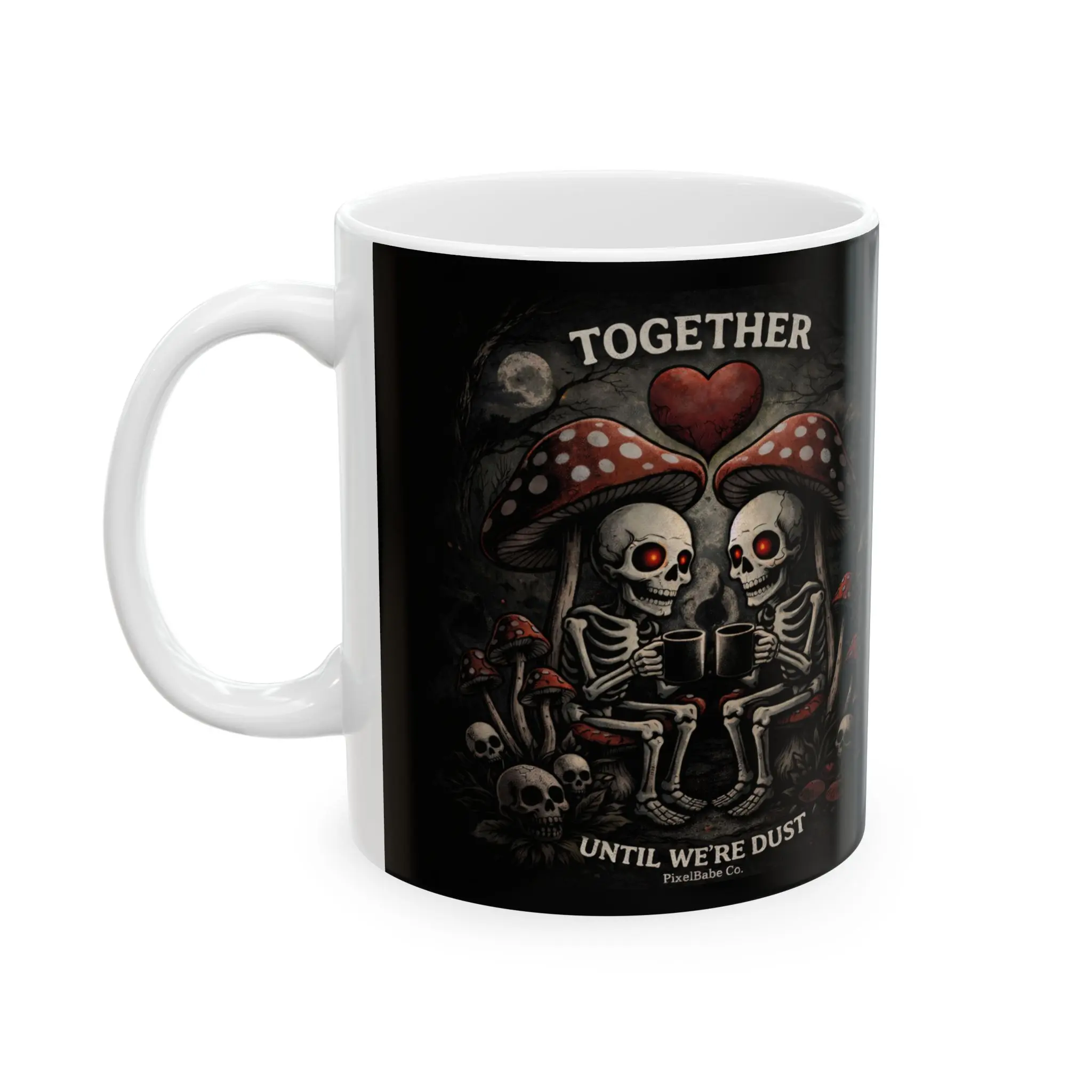 This glossy ceramic mug carries a dark, atmospheric illustration that brings a moody, gothic vibe to your morning ritual. Rich blacks and crimson highlights wrap around the exterior, revealing skulls, mushrooms, and misty woodland details that invite a slow, contemplative sip. The smooth white interior and C-handle make it comfortable to hold while the vivid print stays crisp through daily use. Use it on quiet mornings, late-night writing sessions, or while sharing stories with friends who appreciate the eerie and artful side of life.