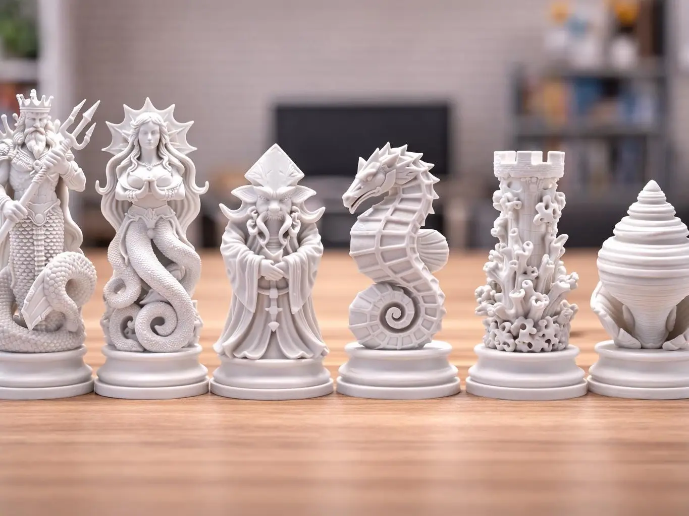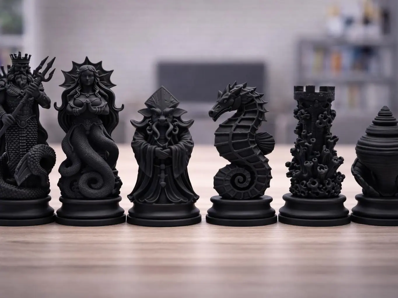 • Ocean mythology inspired chess pieces
