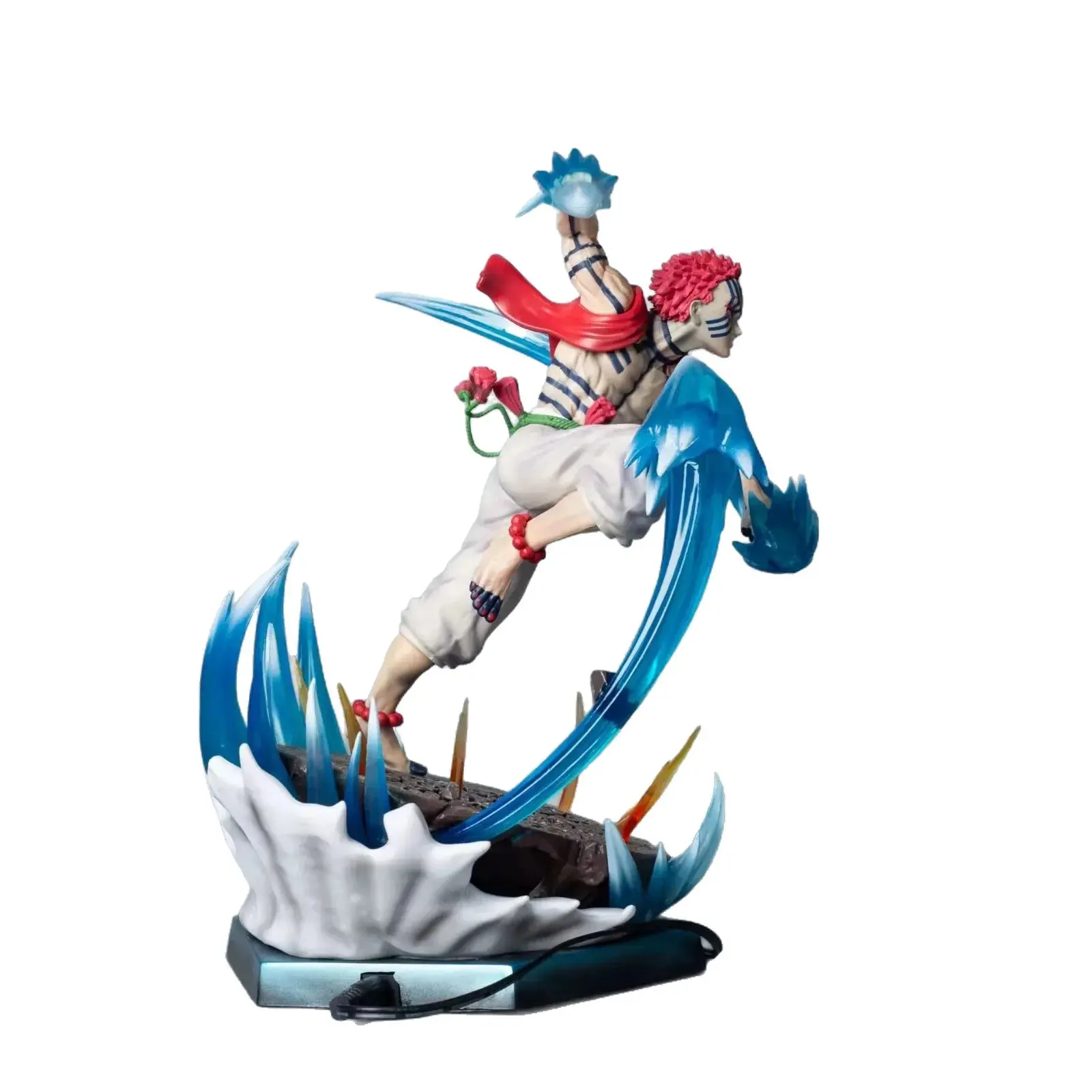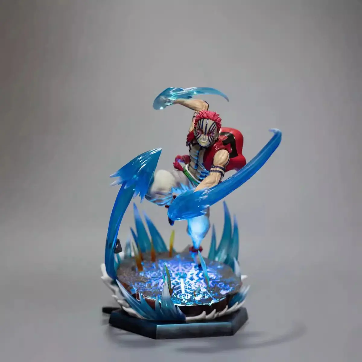 Upper Moon Three absolutely unleashed. This stunning handmade GK statue captures Akaza mid-combat in his Third Form — body fully committed to the attack, massive blue wind compass energy blades erupting and swirling around him in every direction while an illuminated LED base lights the entire scene from below. At 10.2 in (26 cm) the combination of translucent blue resin effect pieces, the handcrafted paint detail on Akaza's markings, and the glowing base make this one of the most visually spectacular Demon Slayer statues available.