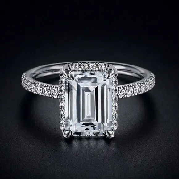 This stunning engagement ring features a brilliant 2 carat radiant-cut center stone, beautifully framed by an elegant halo setting and delicate pavé accents that enhance its sparkle and brilliance. High-end look while remaining comfortable for everyday wear. Style: Radiant Cut, Halo, Pavé Setting Condition: Brand new Packaging: Comes in a gift-ready box A breathtaking ring that delivers elegance, brilliance, and sophistication — ready to make a statement