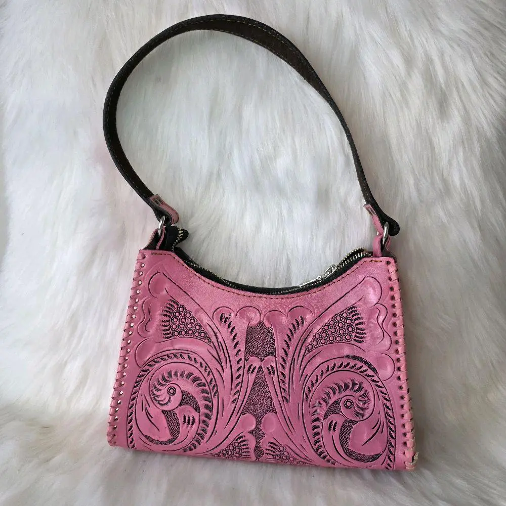 Discover the Laura Pink Embossed Leather Handbag, a stylish accessory for any occasion. This handbag features a chic pink embossed design that adds a touch of sophistication. The black strap complements the pink leather, creating a striking contrast. Perfect for those who appreciate both style and functionality.