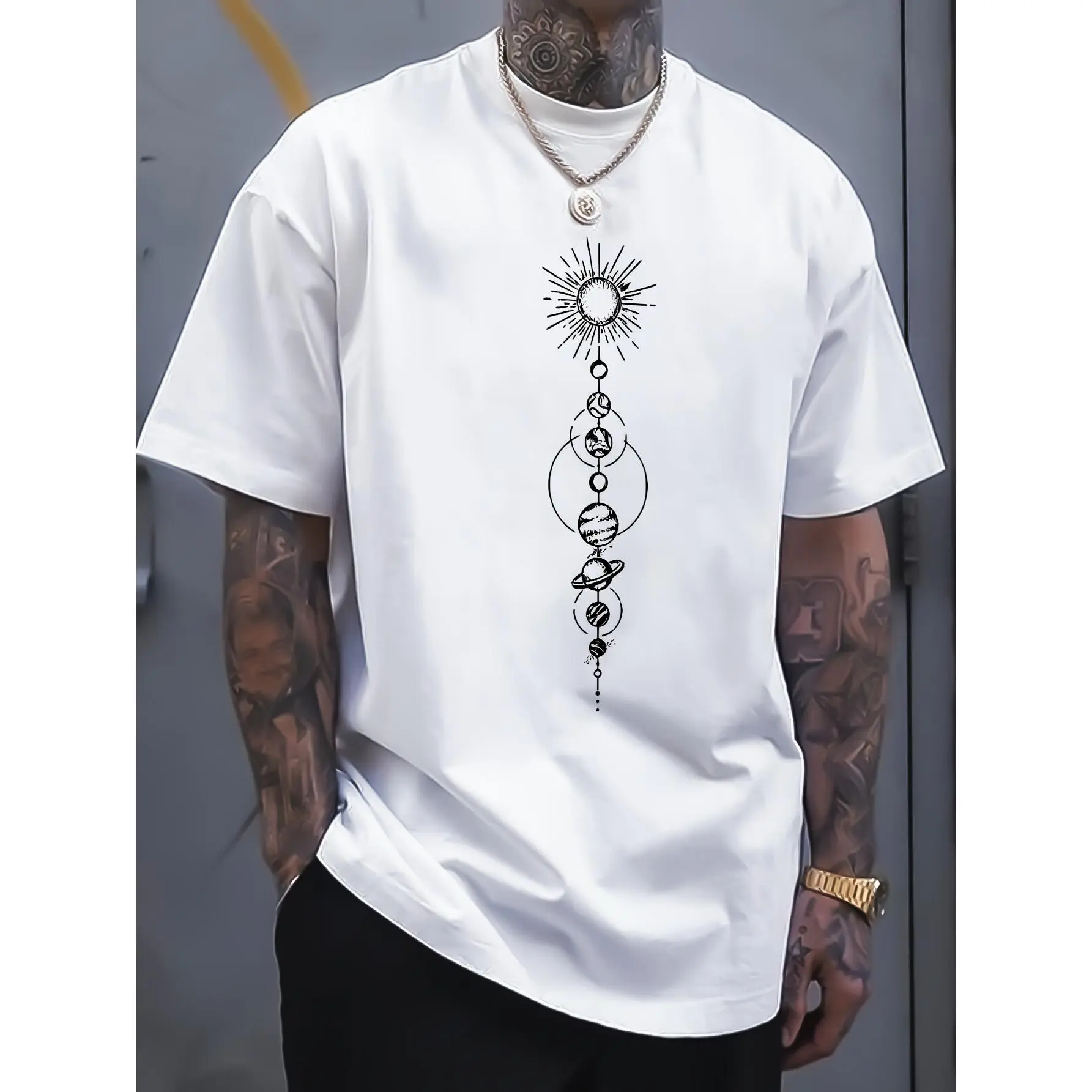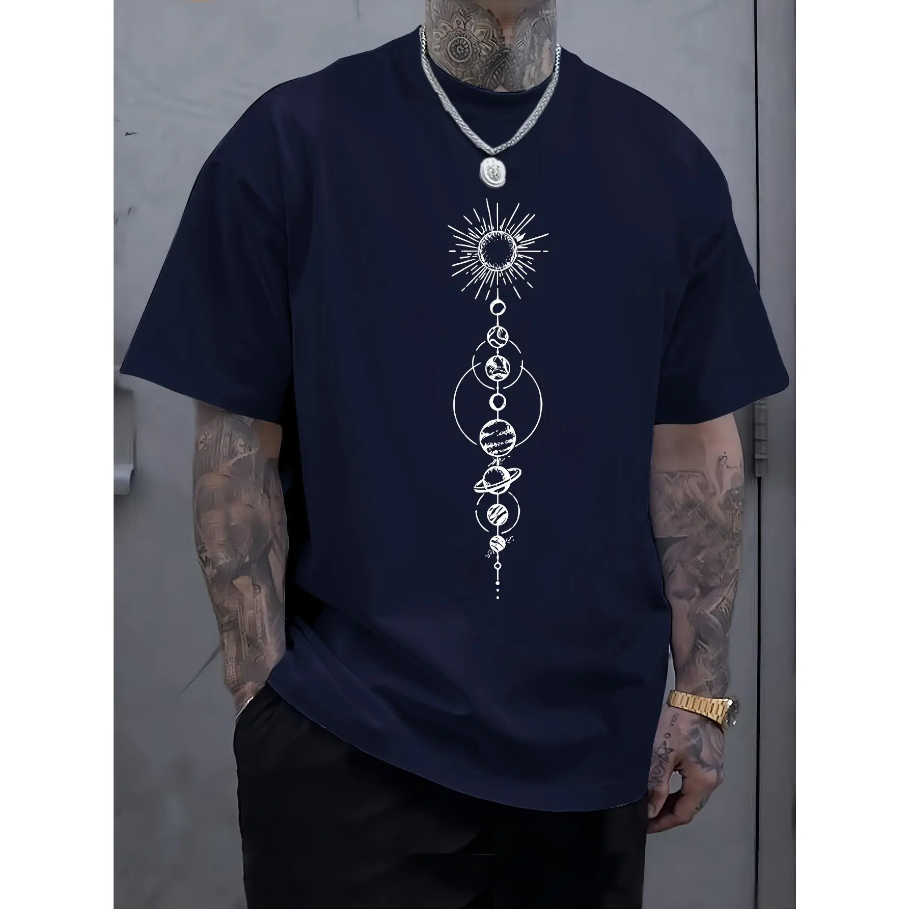 Planet Creative Print Men's Short Sleeve T-Shirt, Casual Round Neck Top, Versatile And Comfortable Tee, Spring& Summer Collection