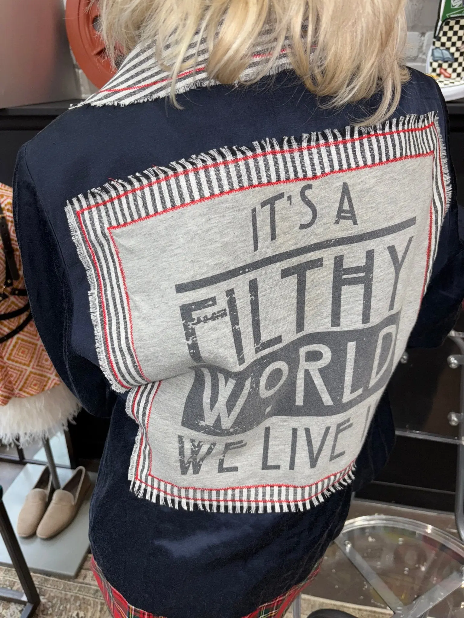 · Reworked with custom back appliqué: “IT’S A FILTHY WORLD WE LIVE IN”