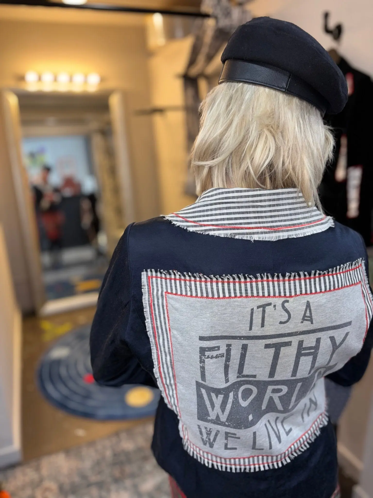 This navy sateen blazer has been completely reworked into a statement of rebellion and reflection. The smooth, tailored base is interrupted by a striking back appliqué reading “IT’S A FILTHY WORLD WE LIVE IN”, transforming this piece from refined classic to wearable manifesto.
