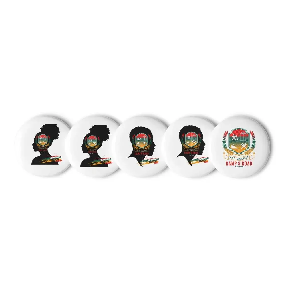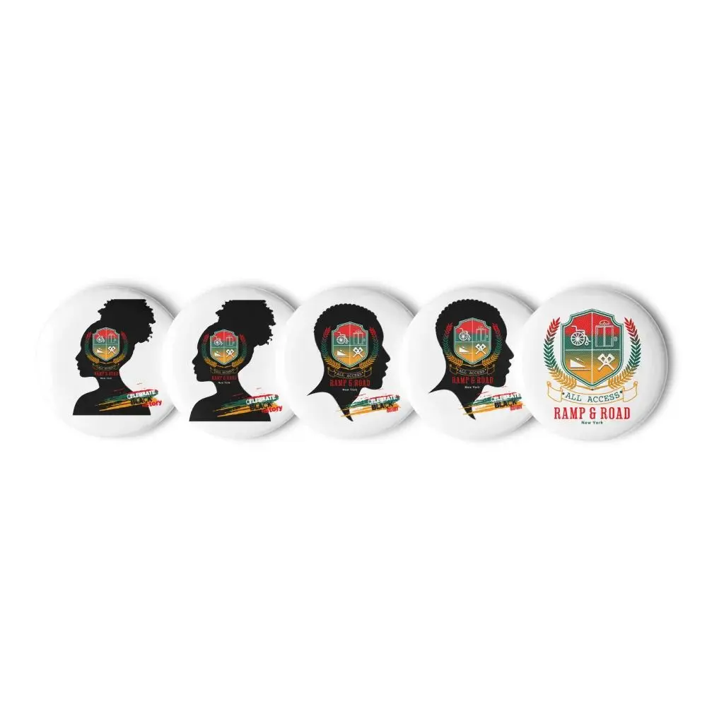 Exclusive pin button set celebrating Black History, featuring scratch-resistant coating and glossy finish. Available in two sizes, 1.25″ and 2.25″, showcasing symbols of accessibility and inclusion. Set of 5 supporting Ramp and Road's mission.