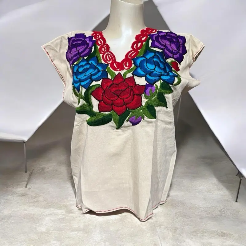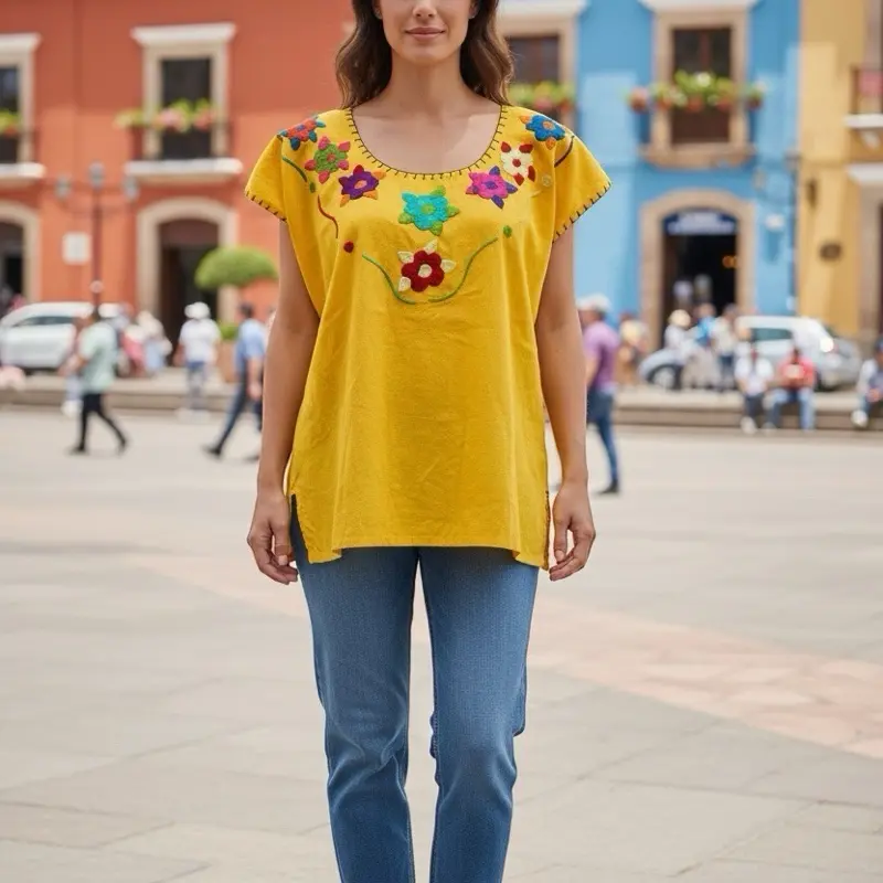 Blusas Bordadaa de Manta - Green Top with Sunflower and Floral Embroidery - Traditional Mexican Design
