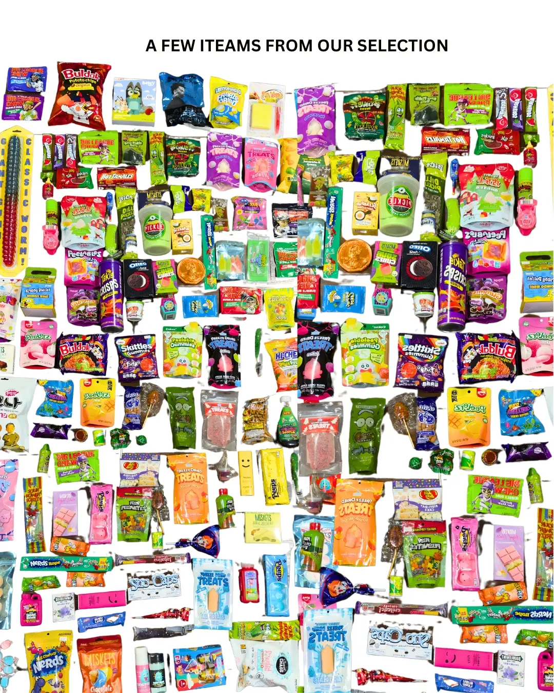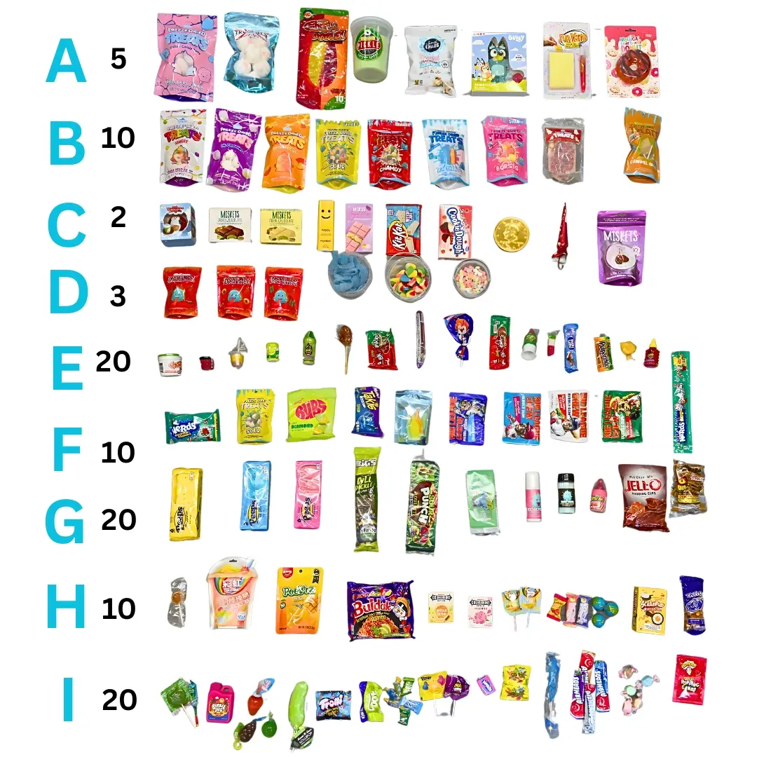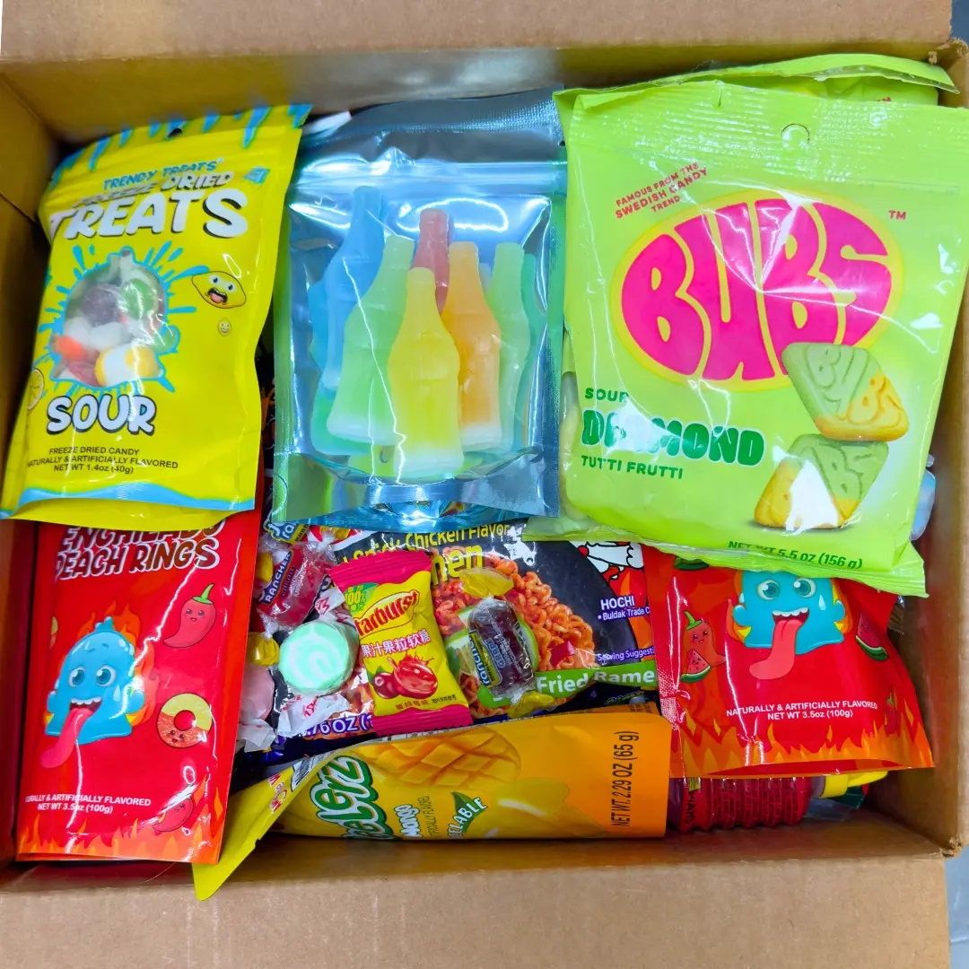 Items may include freeze-dried candy, sour candy, gummies, chocolates, and other snack items.