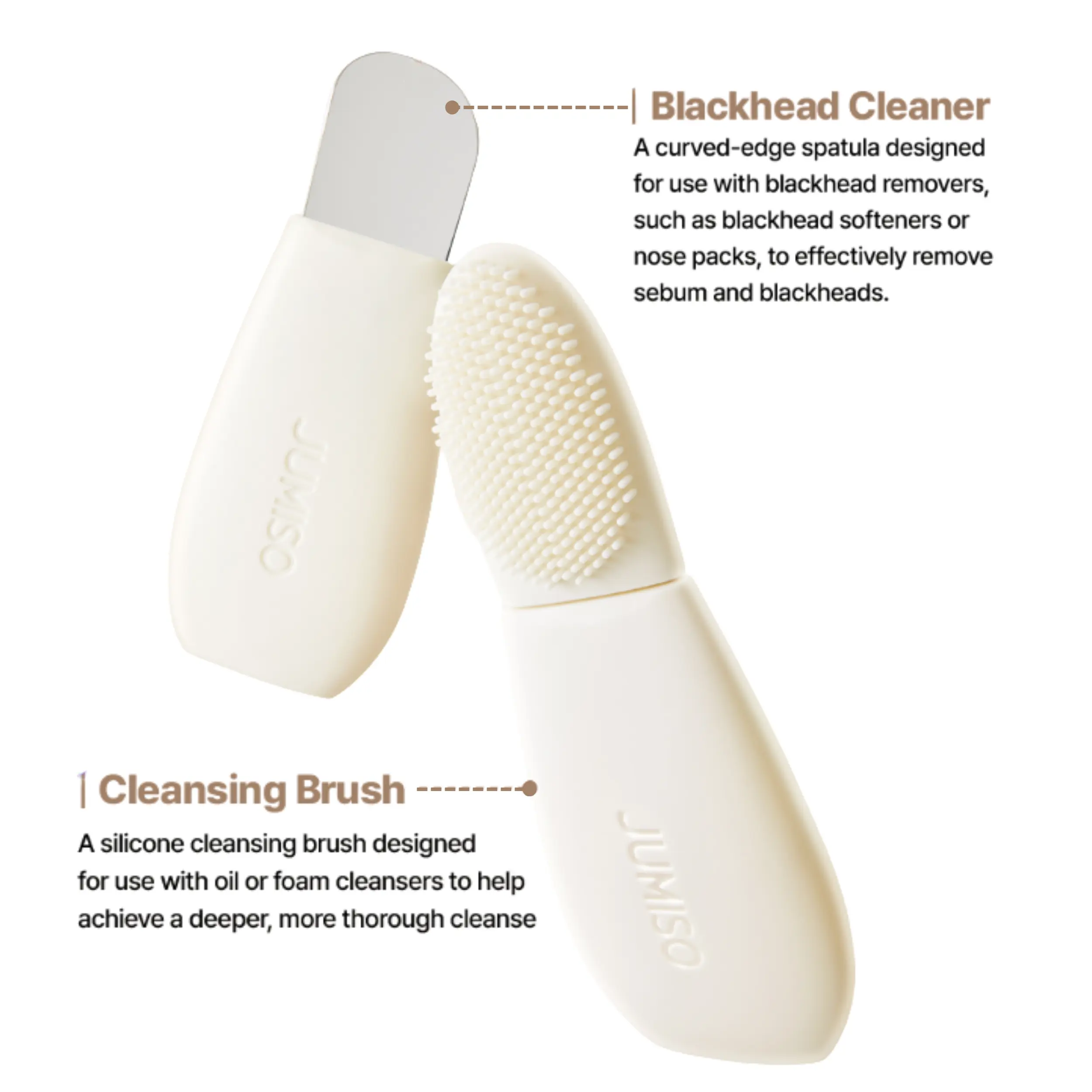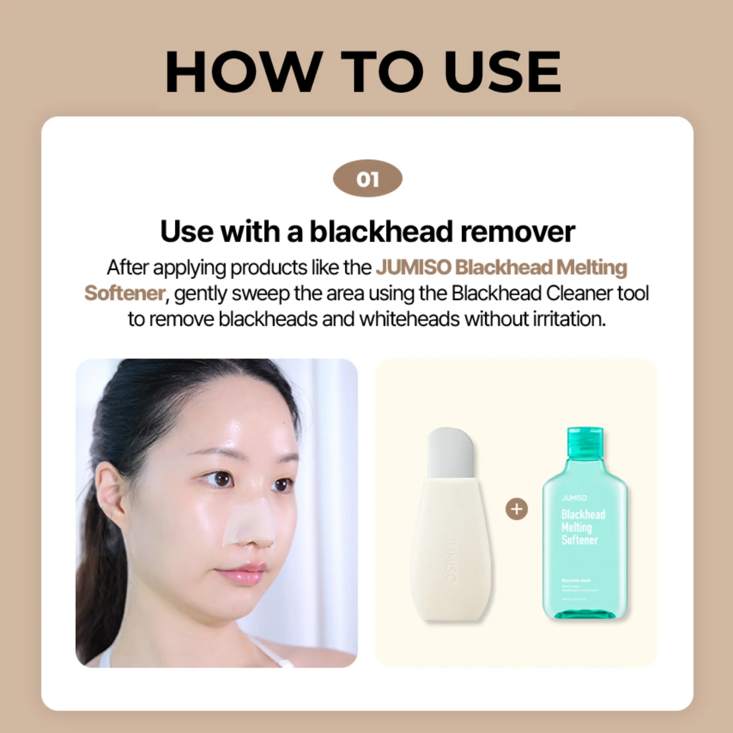 Use with a blackhead remover After applying products like the JUMISO Blackhead Melting Softener, gently sweep the area using the Blackhead Cleaner tool to remove blackheads and whiteheads without irritation.