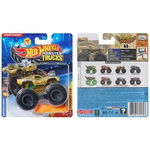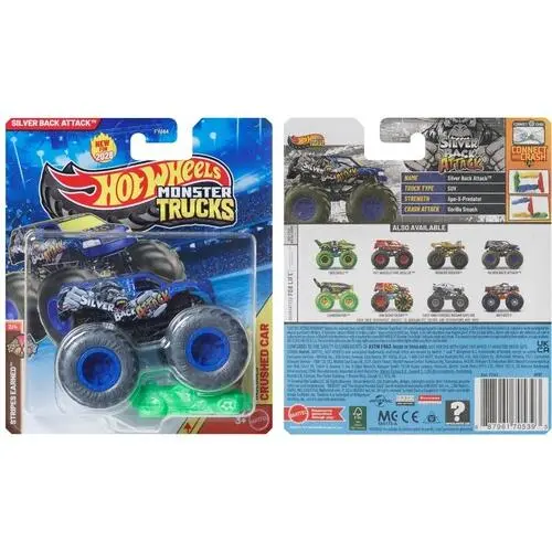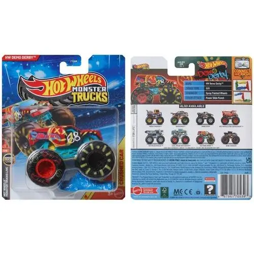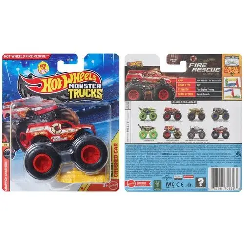Summary:Hot Wheels® Monster Trucks™ 1:64 scale die-cast vehicles are primed for epic smashing and crashing.Each metal toy truck has awesome designs and giant tires and includes a crushable car. The packaging has the truck's name, truck type, strength, unique crash attack and motor-vation.With a wide variety of characters available, collectors and kids will want to get them all.Features:Hot Wheels® Monster Trucks deliver big-time excitement in 1:64 scale with die-cast trucks that have awesome graphics and massive wheels.Each Hot Wheels® Monster Truck comes with a plastic Connect and Crash crushable car for immediate smashing action.Learn about the truck's character with package stats that detail its strength, crash attack, motor-vation and more.Giant wheels and rad details amp up the crashing, smashing and stunt play.Rev up imagination and storytelling with unique Monster Trucks that deliver mind-blowing features fans will want them all.This assortment includes:Fast %26 Furious Nissan SkylineCrocovileRodger DodgerHot Wheels Fire RescueSilver Back AttackCarbonatorHW Demo DerbyBigfootAssortment contains 8 Hot Wheels vehiclesAges 3+Not for use with some Hot Wheels® sets.Subject to availabilityDeco, character, style and color of contents subject to change.