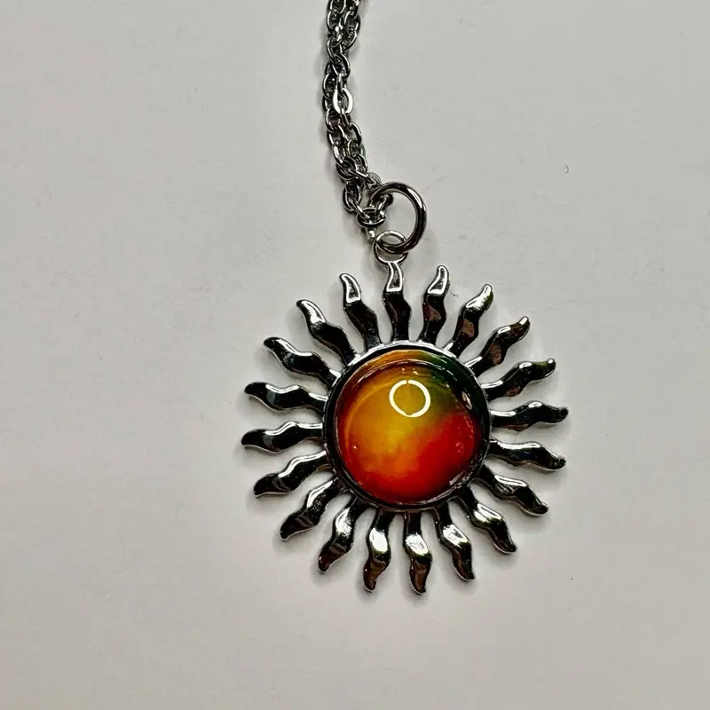20” Stainless Steel Necklace with Handpainted Sun Cabochon - Unique Handcrafted Design