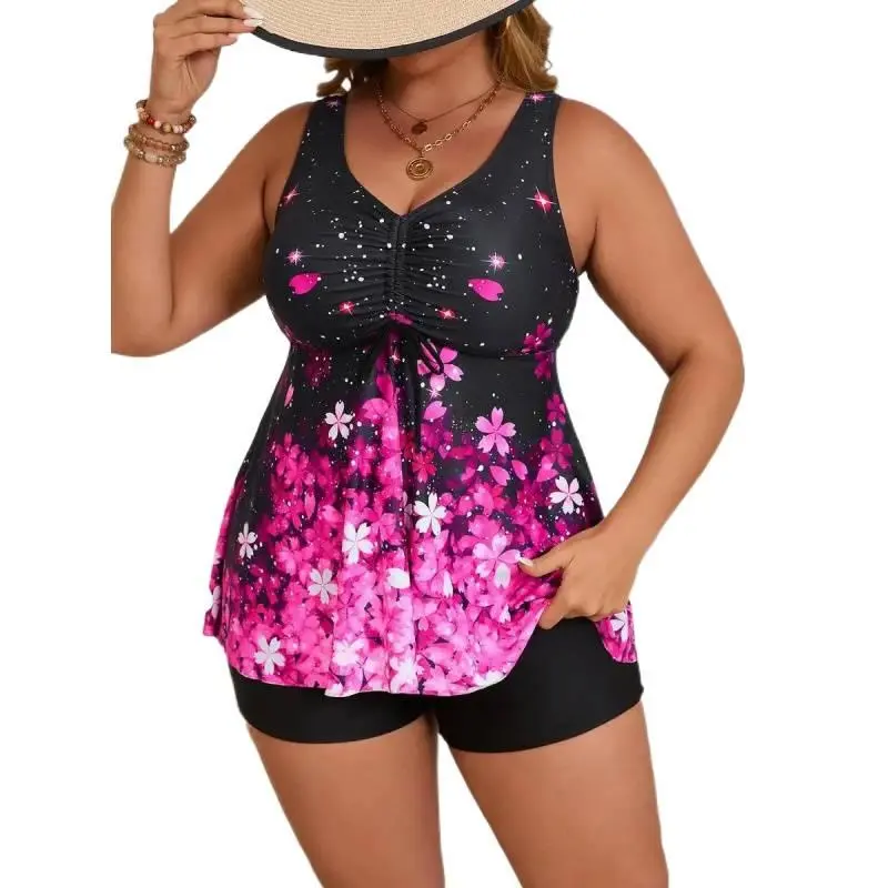 Elevate your beach wardrobe with this 2026Plus Size Floral Tankini Set.Available in sizes 1XL (US 18) to 4XL (US 24), it features a drawstring V-neck swim top and solid shorts.The top boasts a bust 36-42" and length 27-30", while the shorts offer a waist 30-36" and inseam ~12".Crafted from 82% polyester and 18% spandex, it ensures stretchy comfort without pinching or riding up.