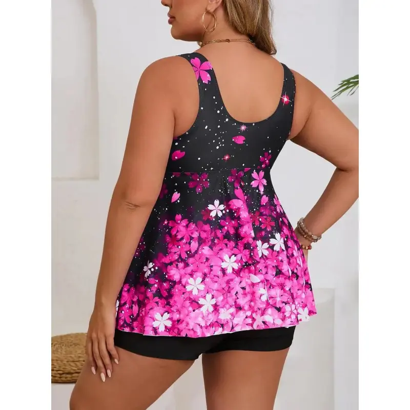 This plus size pink floral tankini swimsuit set is your summer must-have! Ideal for pool trips, resort wear, and curvy beach style. The combination of comfort and charm makes it a versatile choice. No more choosing between "wearable" and "cute" – this set has it all. Embrace your summer style with this must-have swimsuit set!
