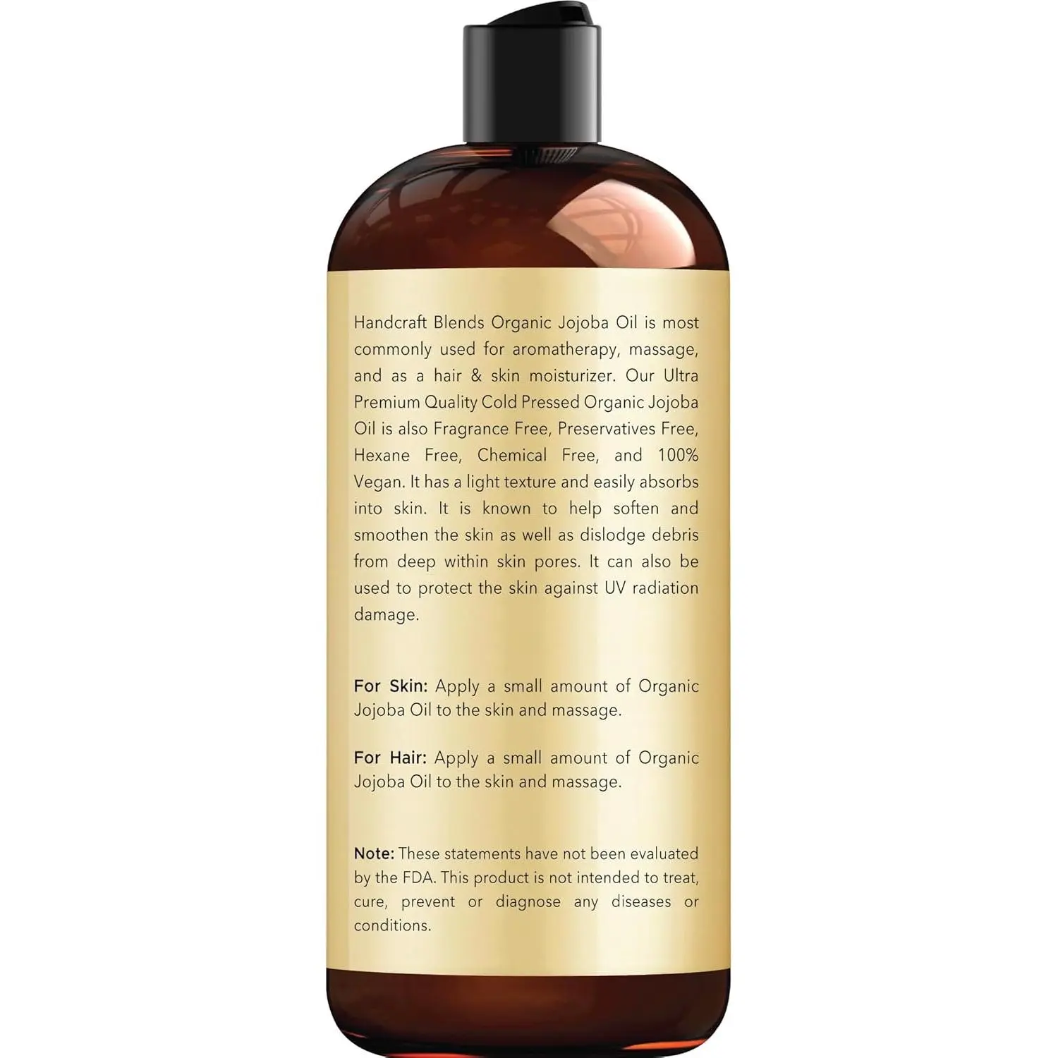 COLD PRESSED NATURAL JOJOBA OIL ORGANIC - Our USDA organic jojoba oil is extracted from the jojoba seeds using cold pressed extraction method. It is most used for aromatherapy, massage and as a hair and skin moisturizer. Our premium quality jojoba carrier oil is hexane free, preservative free, chemical free and 100% vegan.