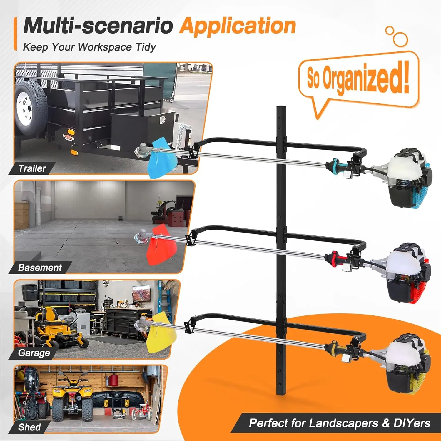 LOCKABLE TRIMMER RACK - The 3 place lockable trimmer rack features locking holes and an easy snap-in design, with locking devices on both sides for secure fastening and convenient access.Equipped with 3 locks, the hedge trimmer holder can be securely locked in place using our matching locks and deterring theft.STURDY & RUSHPROOF - Constructed from heavy-duty, high-strength hardened carbon steel.The powder coating extends the life of your rack even longer, and also protects against rust.MULTIPLE MOUNTING OPTIONS - Designed for quick and easy installation.The trimmer rack for open trailer provides all the components needed to mount the trimmer, ensuring a safe and stable installation by offering various mounting options such as wall-mount or trailer-mount to suit different locations and settings.MAXIMIZE SPACE UTILIZATION - CAROD 3-position weedeater rack is designed to transport and store trimmers, edgers or shaft hedge shears.Ample space between each trimmer to prevent accidental collisions.It accommodates most straight-shaft trimmers, it will keep your trimmers, edgers, shaft hedge shears safe from scratches when transporting.PACKAGE CONTENT - 1 x Trimmer Holder w/3 keyed a-like locks. Fits most straight tools, such as lawn trimmers, string trimmers, hedge trimmers with extension poles, lawn edgers, grass trimmers, weed eaters, tillers, pole saws, weed wackers, and other manual hand tools.
