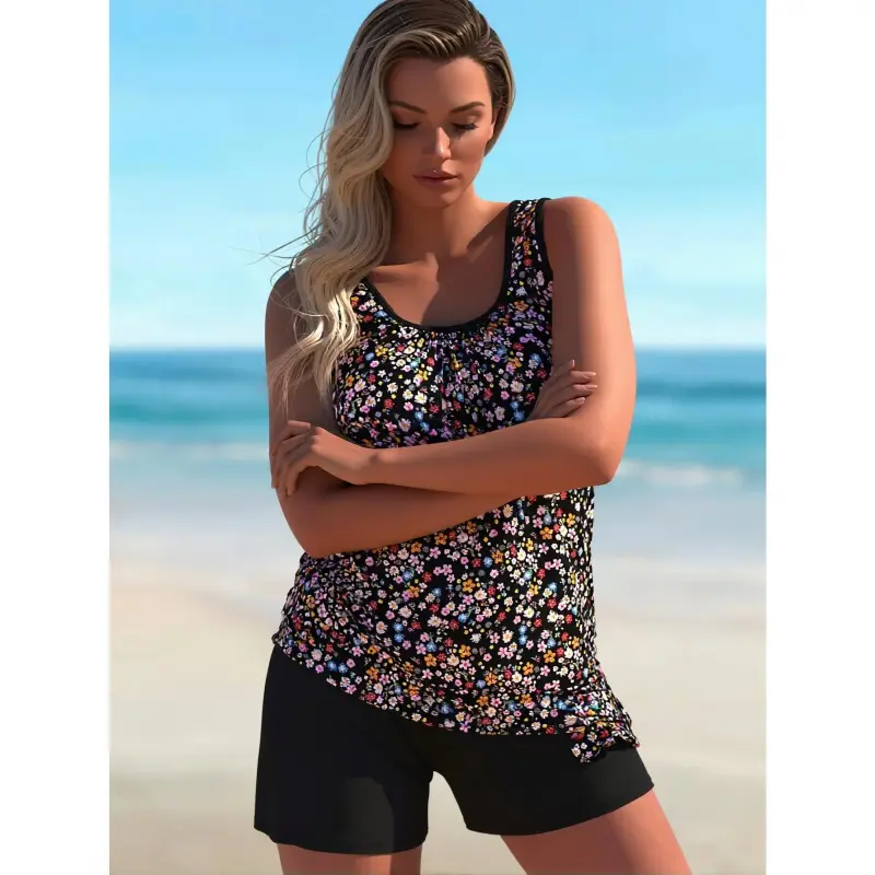 FSTVE Curve-Friendly Stretch Design for All-Day Wear Plus Size Swimsuit Pink Floral Top & Black Shorts for Pool Trips Plus Size Bathing Suit 1XL 2XL 3XL 4XL tankini-Elasticity Underwire casual round neck swim top Trendy Scallop