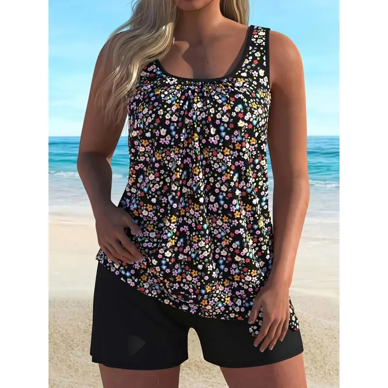 FSTVE 2025 Plus Size Floral Print Tankini Set with Removable Pads, V-Neck Modest Two Piece Swimwear, Polyester and Elastane Blend, Medium Stretch, Elegant Knit Fabric Beachwear for Women tankini HOT