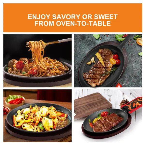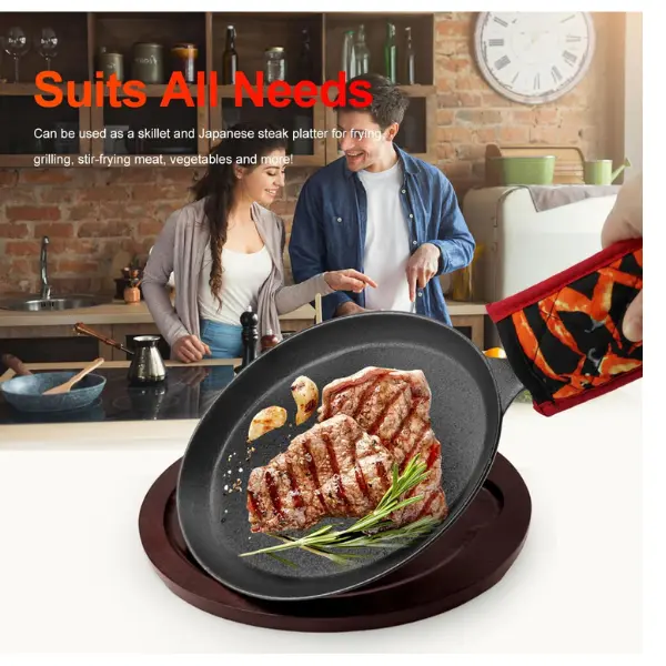 ✨ Perfect for Fajitas and More! This cast iron skillet is ideal for home barbeque and kitchen service. It comes with a wooden base for stability and a scald protection hot mitt for safety. The set includes 2PCS, making it versatile for various cooking needs. Elevate your cooking experience with this durable and functional skillet.