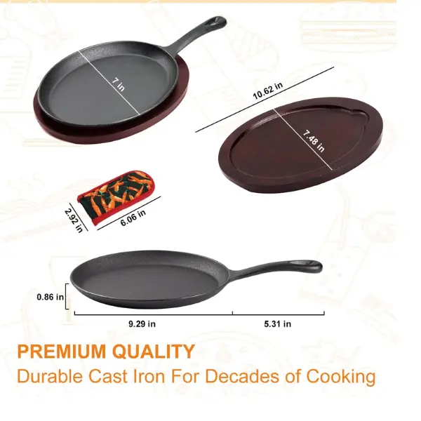 Cast Iron Sizzling Plate with Wooden Base & Handle Cover – Fajita Skillet for BBQ & Kitchen