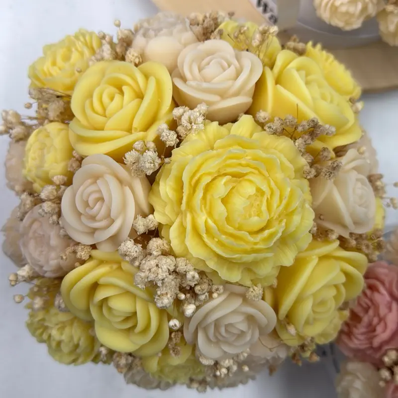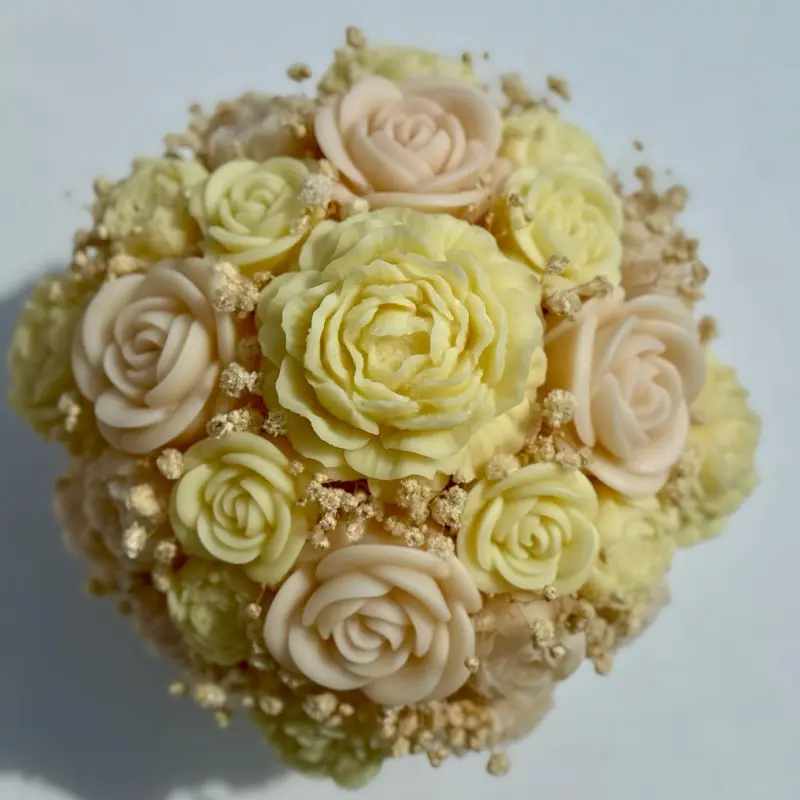 ·Yellow and cream Roses: The bouquet features vibrant yellow and peach roses, adding a touch of elegance and color. These flowers enhance the visual appeal of the candle, making it a delightful centerpiece.
