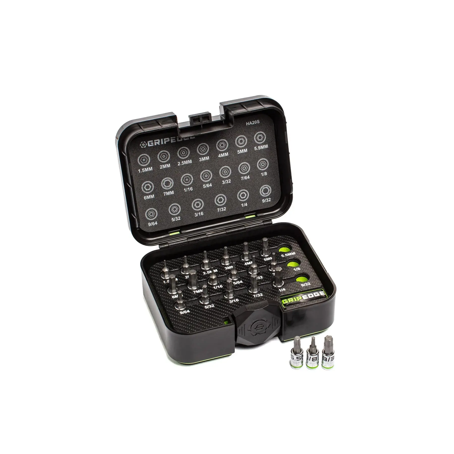 ·20-PC 1/4" Drive Short RPT Hex Driver Set (HA20S)Metric: 1.5, 2, 2.5, 3, 4, 5, 5.5, 6, 7 MMSAE: 1/16, 5/64, 3/32, 7/64, 1/8, 9/64, 5/32, 3/16, 7/32, 1/4, 9/32"