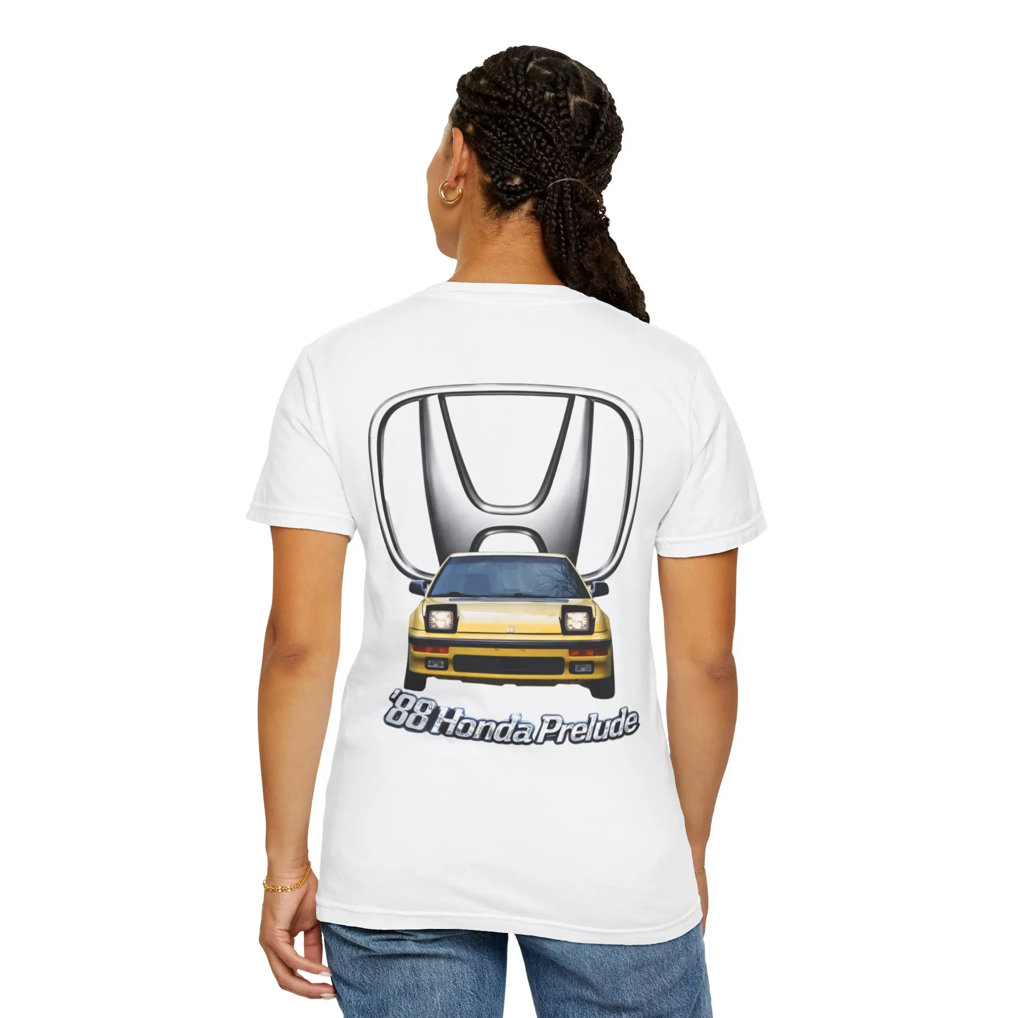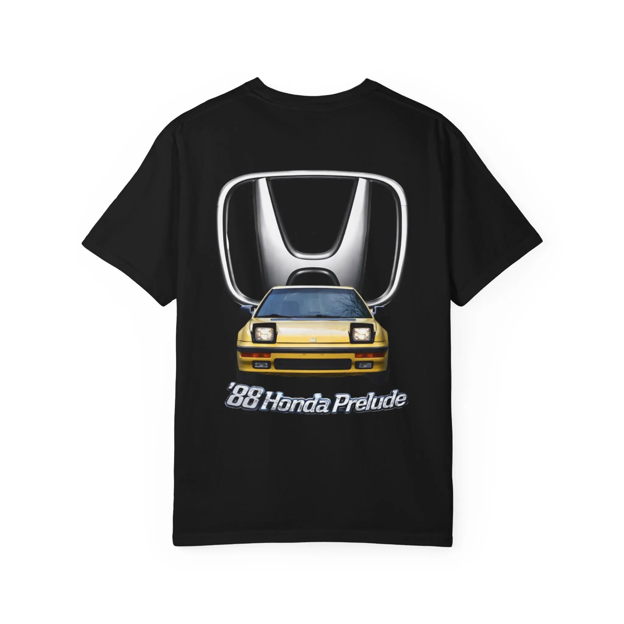 This heavyweight garment-dyed tee brings vintage car culture to everyday wear. The soft, lived-in dye and relaxed cut feel like a favorite right away, while the bold automotive artwork on the back — a classic late-80s Honda Prelude in front of a stylized emblem — announces a quiet love for retro rides. Wear it to weekend cruises, meet-ups, or while wrenching in the garage. The sturdy construction and pre-shrunk ring-spun cotton stand up to regular wear and washes, keeping the print vibrant and the shirt comfortable. Available in many colors and sizes, it blends practical durability with a touch of enthusiast style.