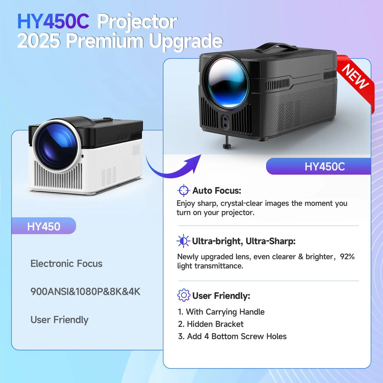 With 900 ANSI lumens of brightness and an ultra-short throw ratio of 0.6:1, the HY450C projects a large screen from a very short distance—perfect for small rooms or limited spaces. Advanced Auto Focus, Auto Keystone Correction, and Auto Image Shift ensure a perfectly aligned and clear image every time, without manual adjustments.