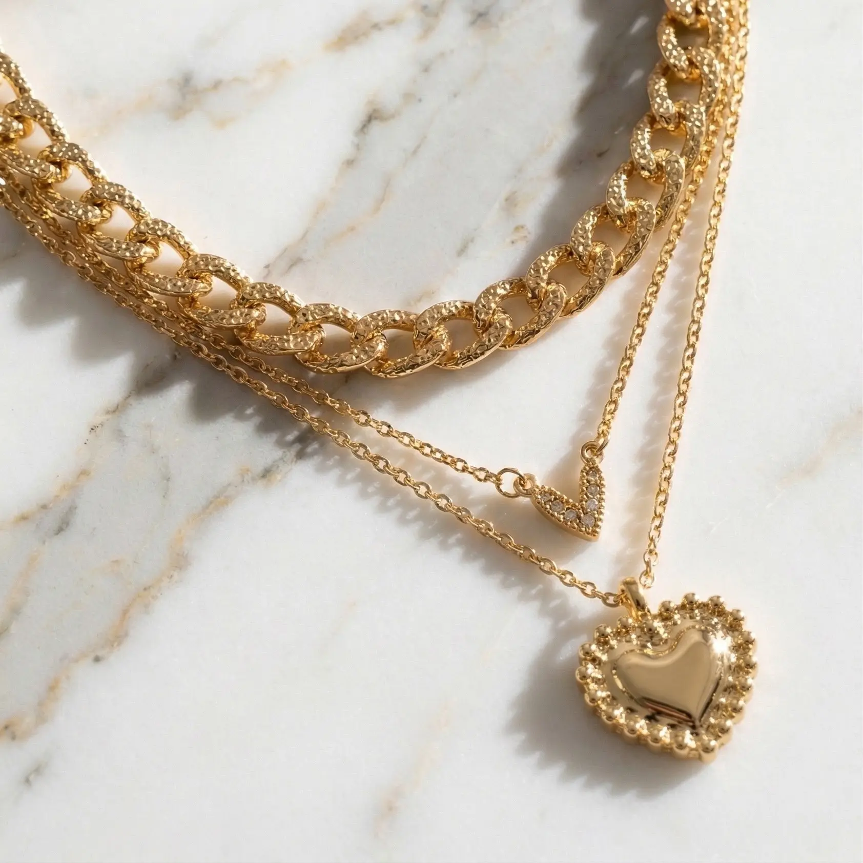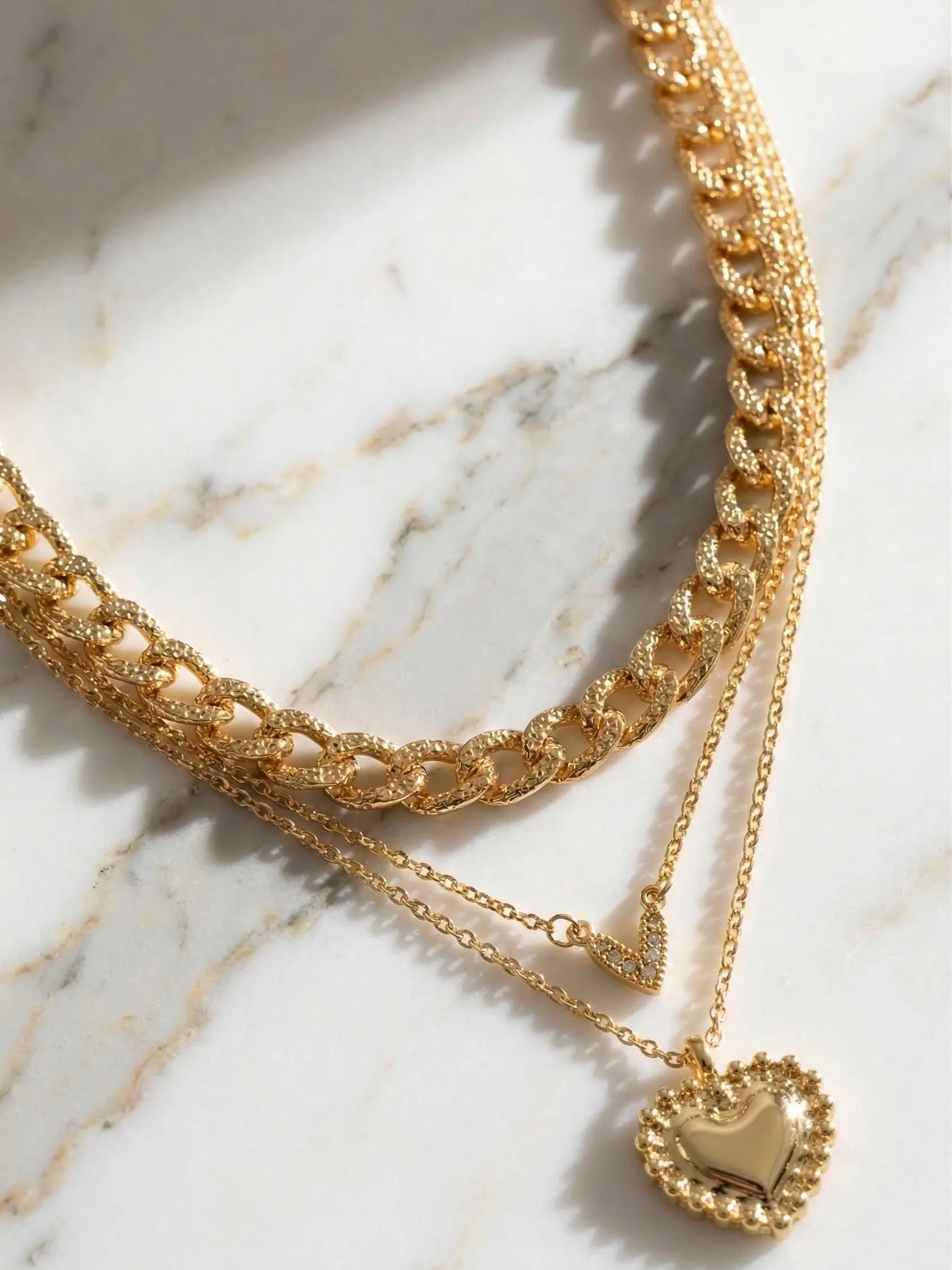 Elevate your jewelry game with this stunning 3-piece layered gold necklace set Featuring a bold textured chain, a delicate rhinestone heart charm, and a statement heart pendant, this set gives you the perfect stacked look without the hassle. Wear them together for a trendy layered vibe or mix and match for everyday elegance.