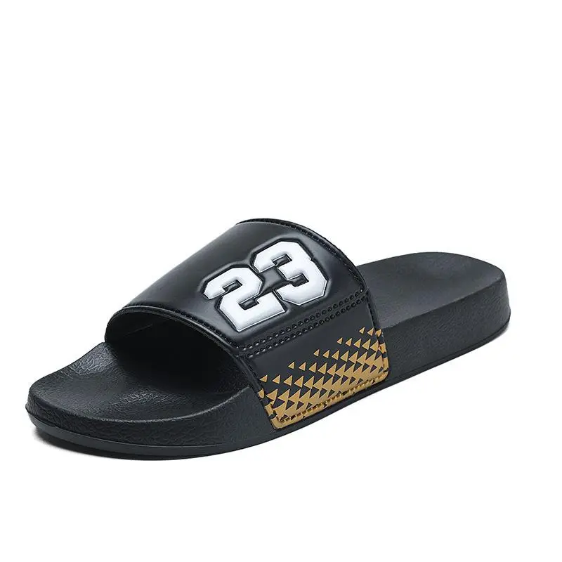 Featuring a bold “23” number graphic, these slides bring a trendy athletic vibe inspired by basketball culture and streetwear fashion.