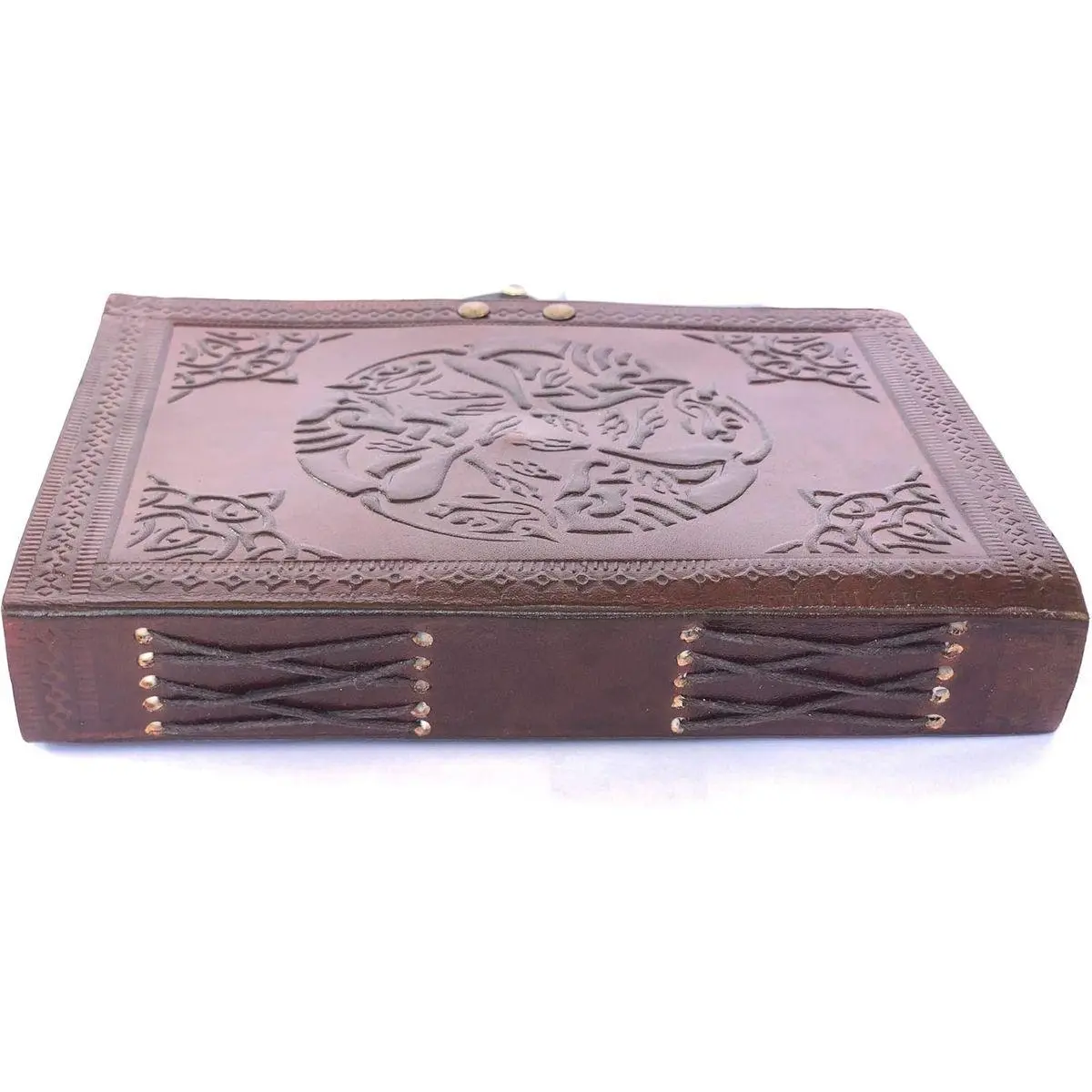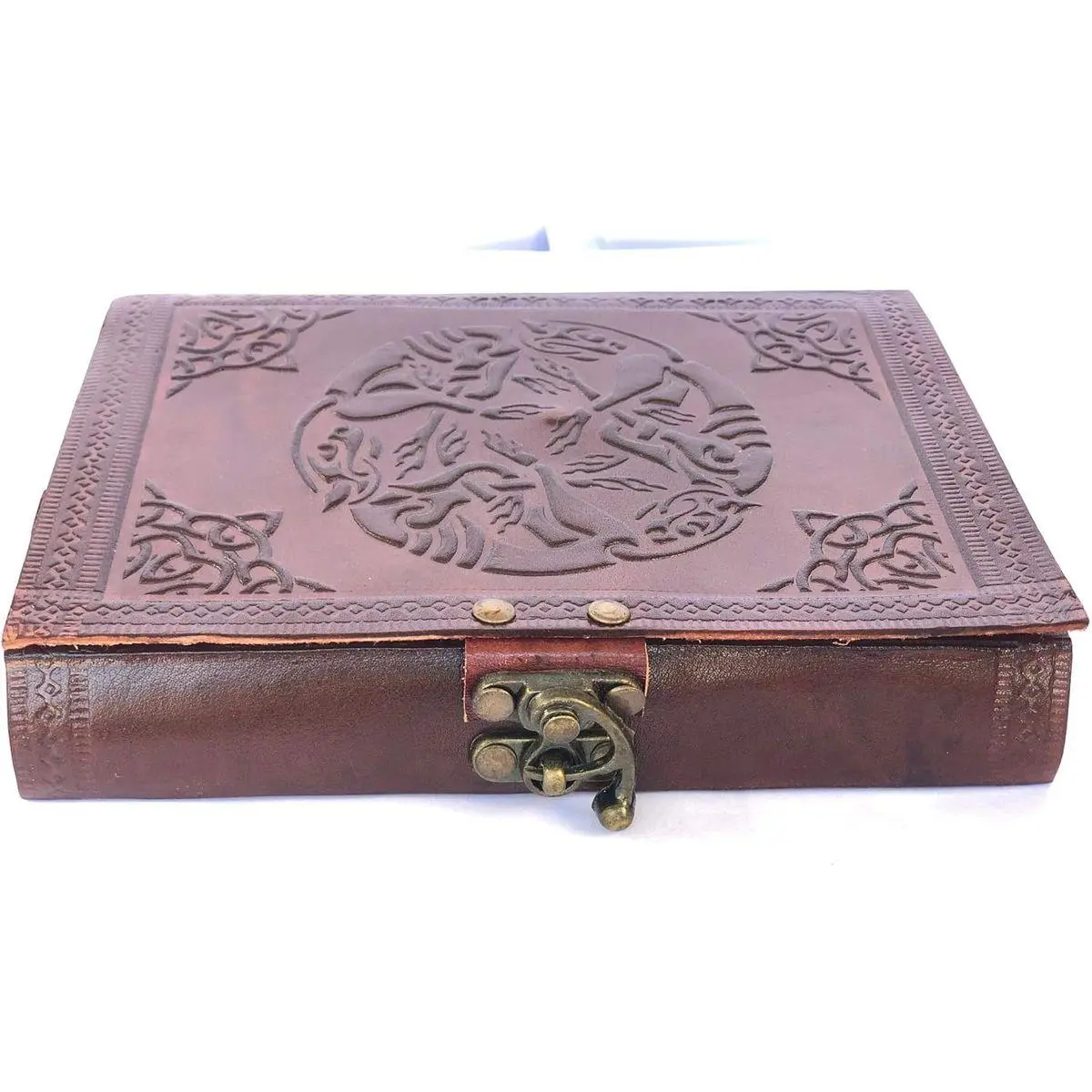 FEATURES: Leather Sketchbook n Notebook is made of 100% Genuine Leather Cover with embossed design, 7 inches tall, 5 1/s to 4 inches wide, and 1 1/4 inches thick. Unlined/Unruled,120 leaf journal, or 240 pages. Antiqued brass swing Clasp Lock on Notebook for security. Cream color handmade Eco Friendly Non Bleeding paper sheets made up of recycled cotton biomass is acid & tree thus environment friendly.