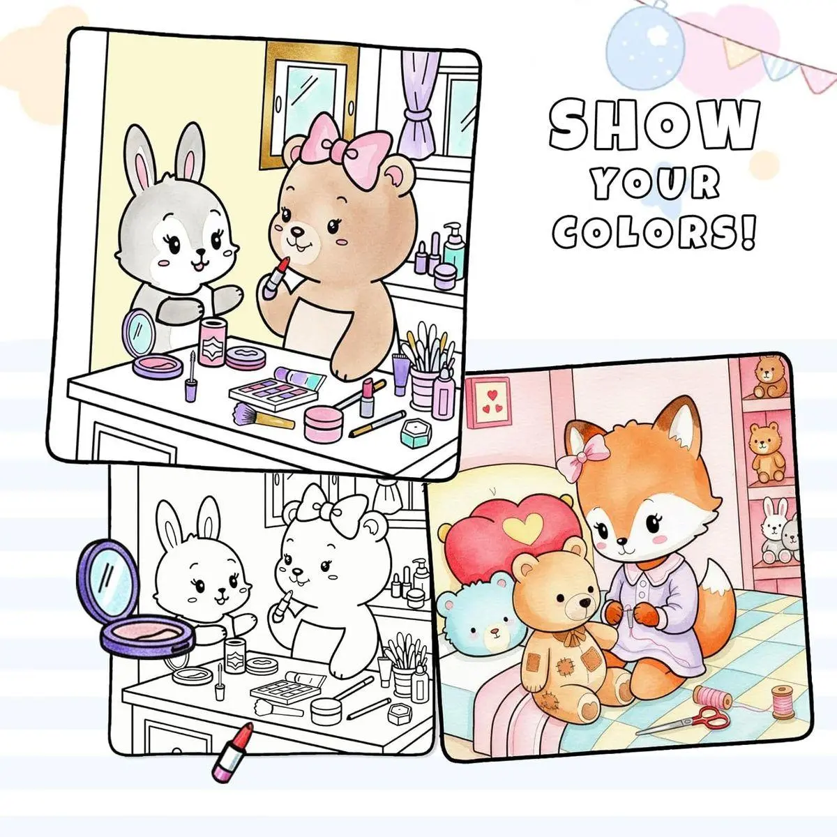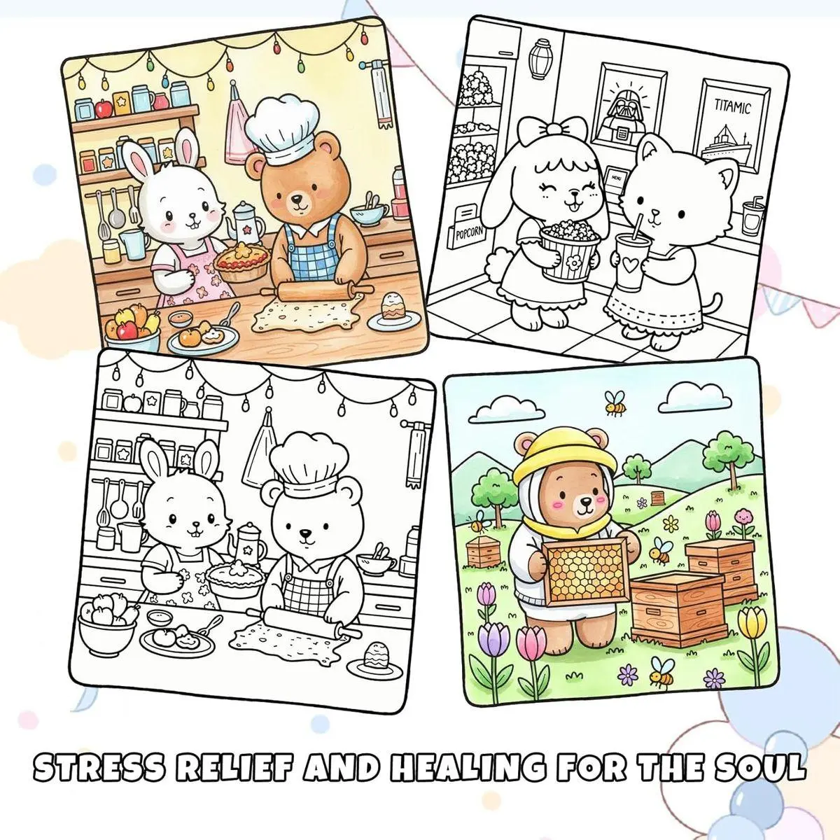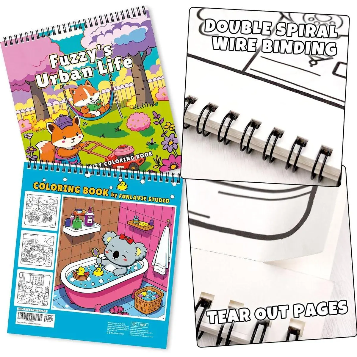 Cozy Coloring Book for Adults: Adorable Animal City Life Scenes Step into Fuzzy's cozy urban world—this adult coloring book features 32 heartwarming scenes of animals enjoying city life: rowing on lakes, flying in hot air balloons, having joyful picnics, picking coconuts, and more. With simple and soothing designs, it’s a perfect coloring book for adults to relax, de-stress, and spark creativity. This coloring book is a must-have for adult relaxation