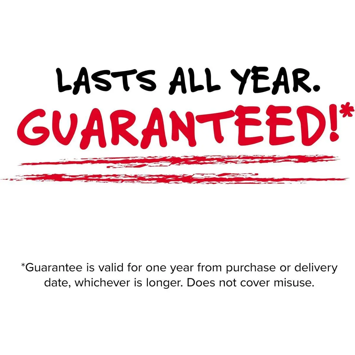 LASTS ALL YEAR. GUARANTEED! Guarantee is valid for one year from purchase or delivery date, whichever is longer. Does not cover misuse.