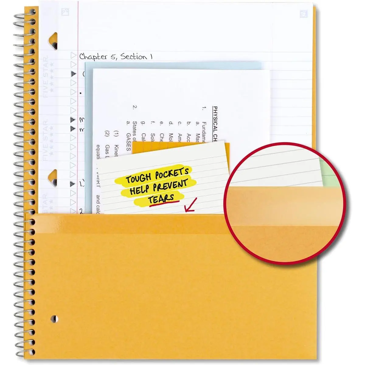 Tough pockets help prevent tears and hold 8-1/2" x 11" loose sheets. Durable plastic front cover is water-resistant to help protect your notes and our Spiral Lock wire helps prevent snags on clothes and backpacks.