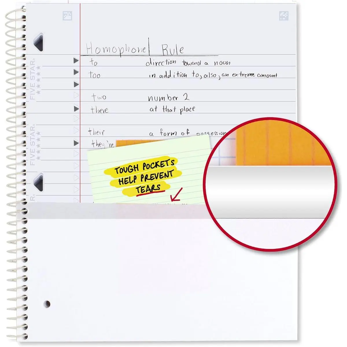 Tough pockets help prevent tears and hold 8" x 10-1/2" loose sheets. Durable, plastic front cover is water-resistant to help protect your notes and our Spiral Lock wire helps prevent snags on clothes and backpacks.