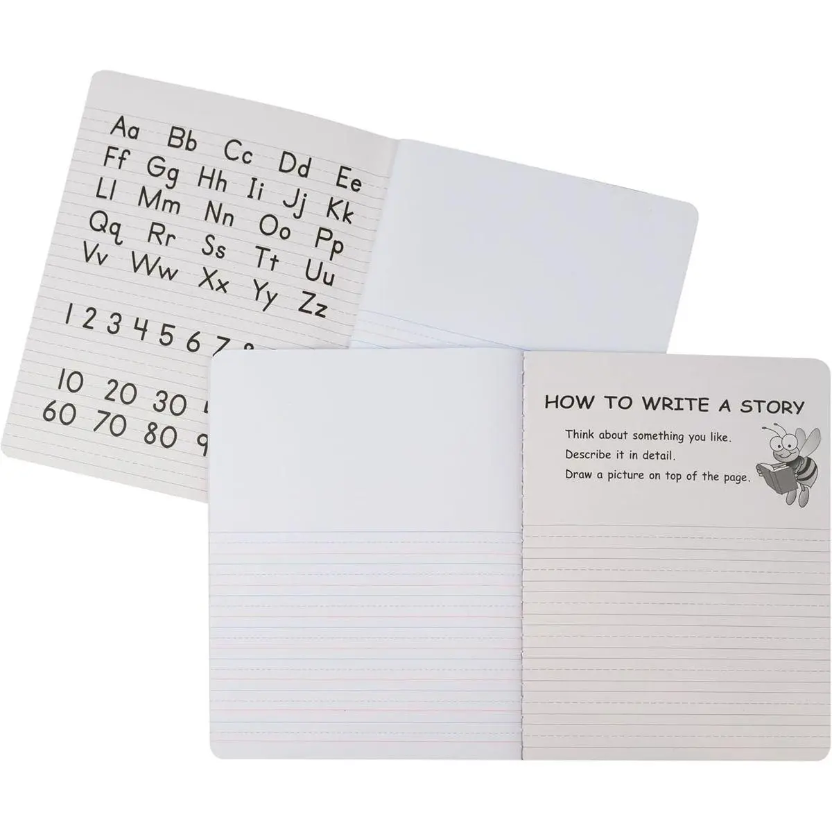 Ideal for note-taking and story development. Inside front cover shows alphabet and numbers. Inside back cover illustrates “How To Write A Story”.