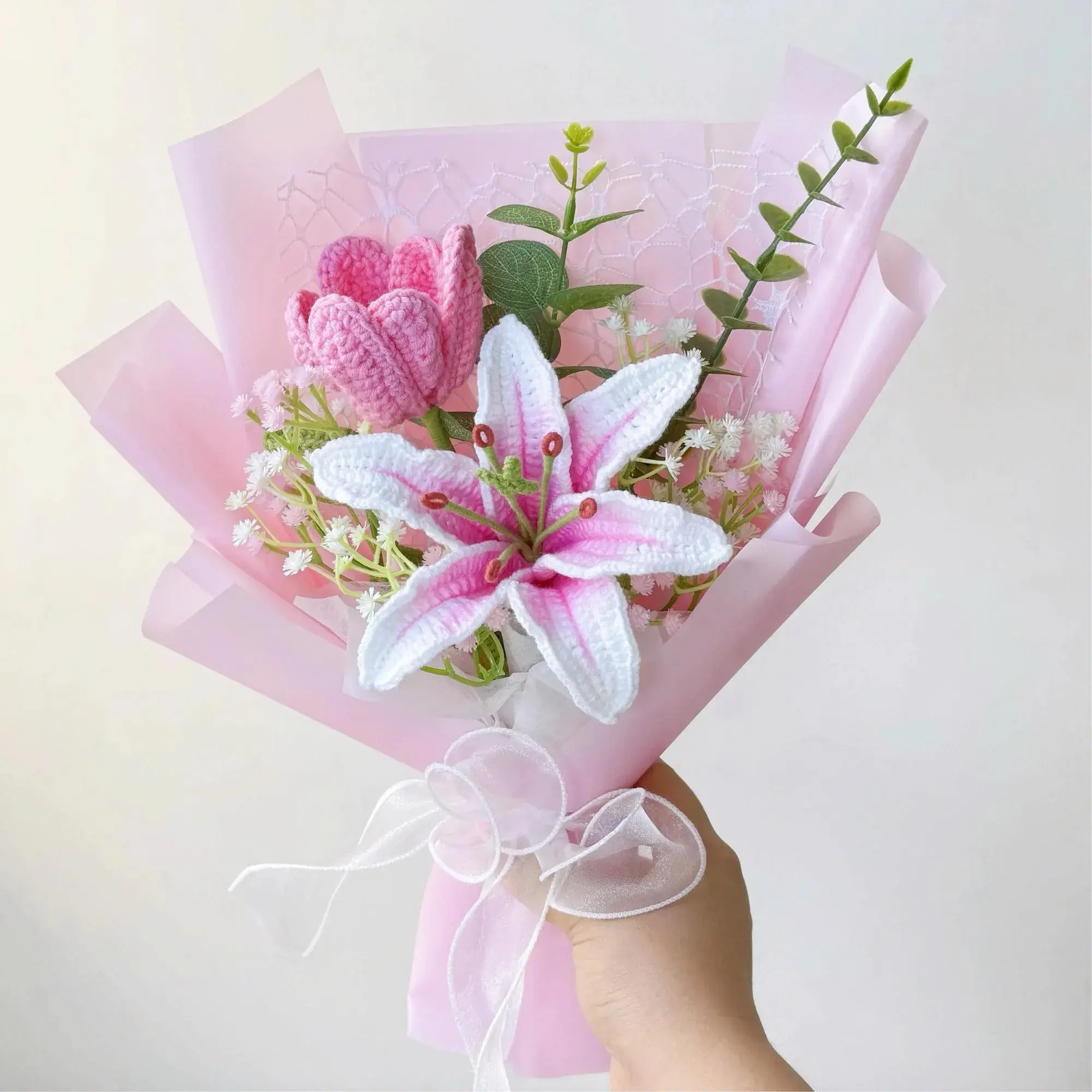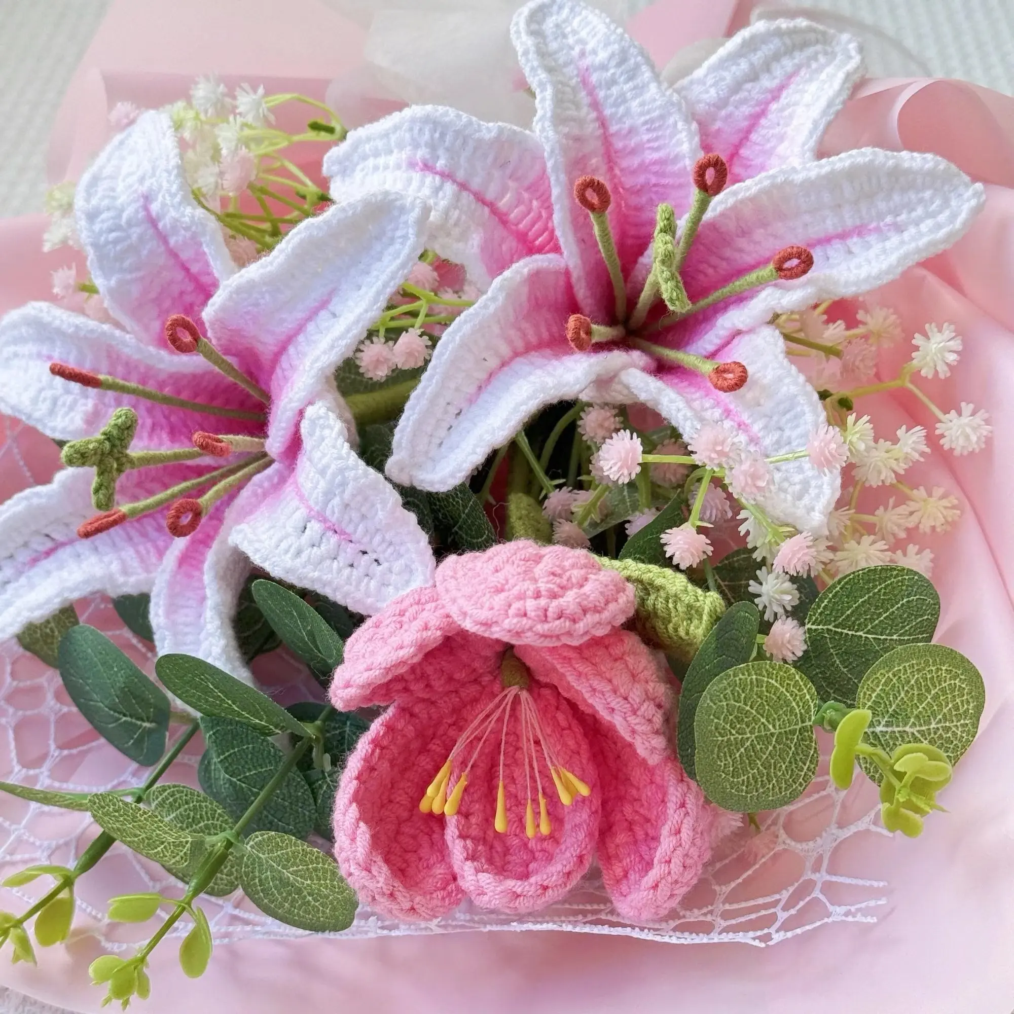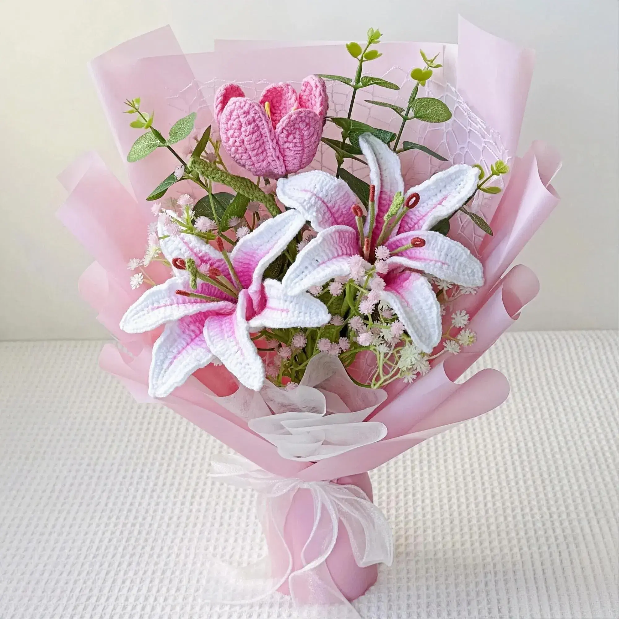 (Note: color may vary slightly due to lighting and screen settings.)Handmade crochet/knitted-style lily bouquet featuring pink-and-white stargazer lilies — a forever flower arrangement that brings soft spring elegance to your home, and a meaningful gift for Mother’s Day, birthdays, anniversaries, or “just because”.