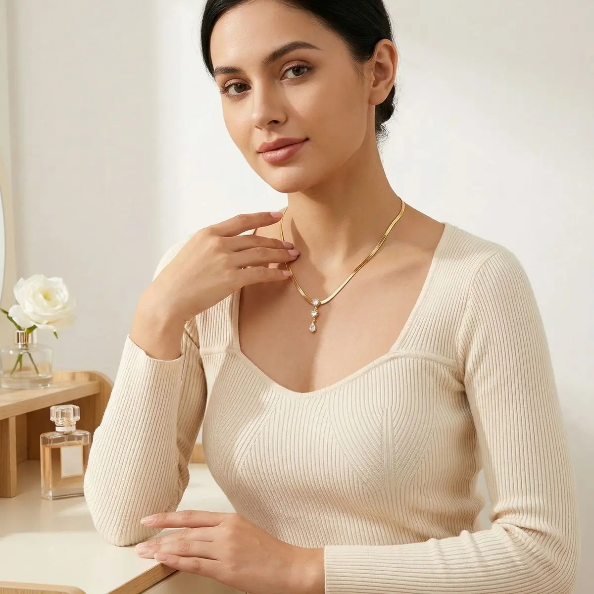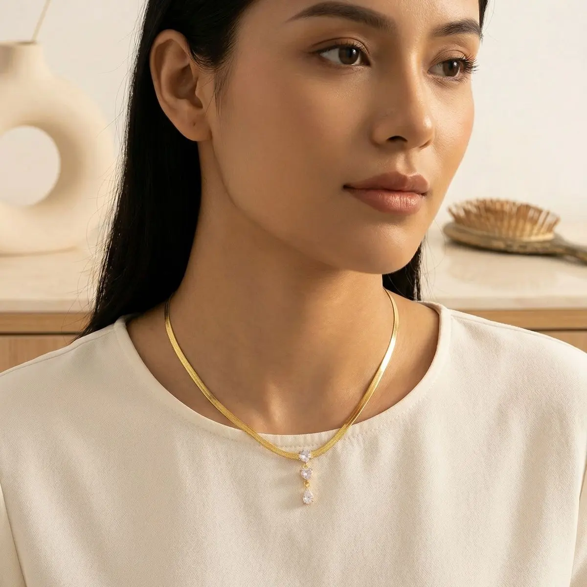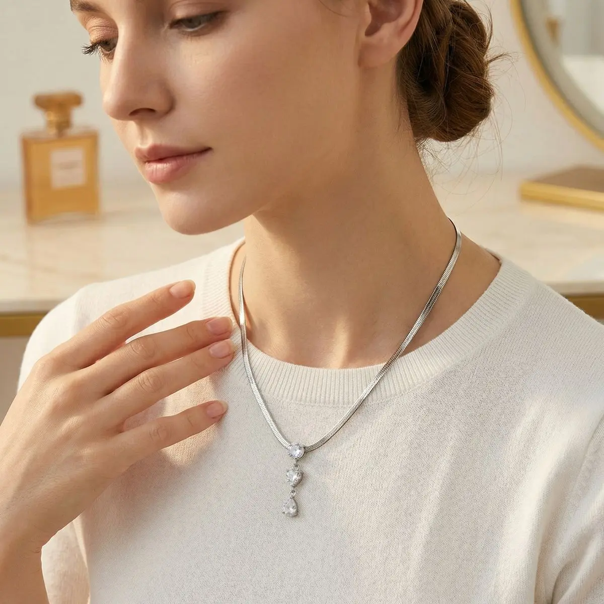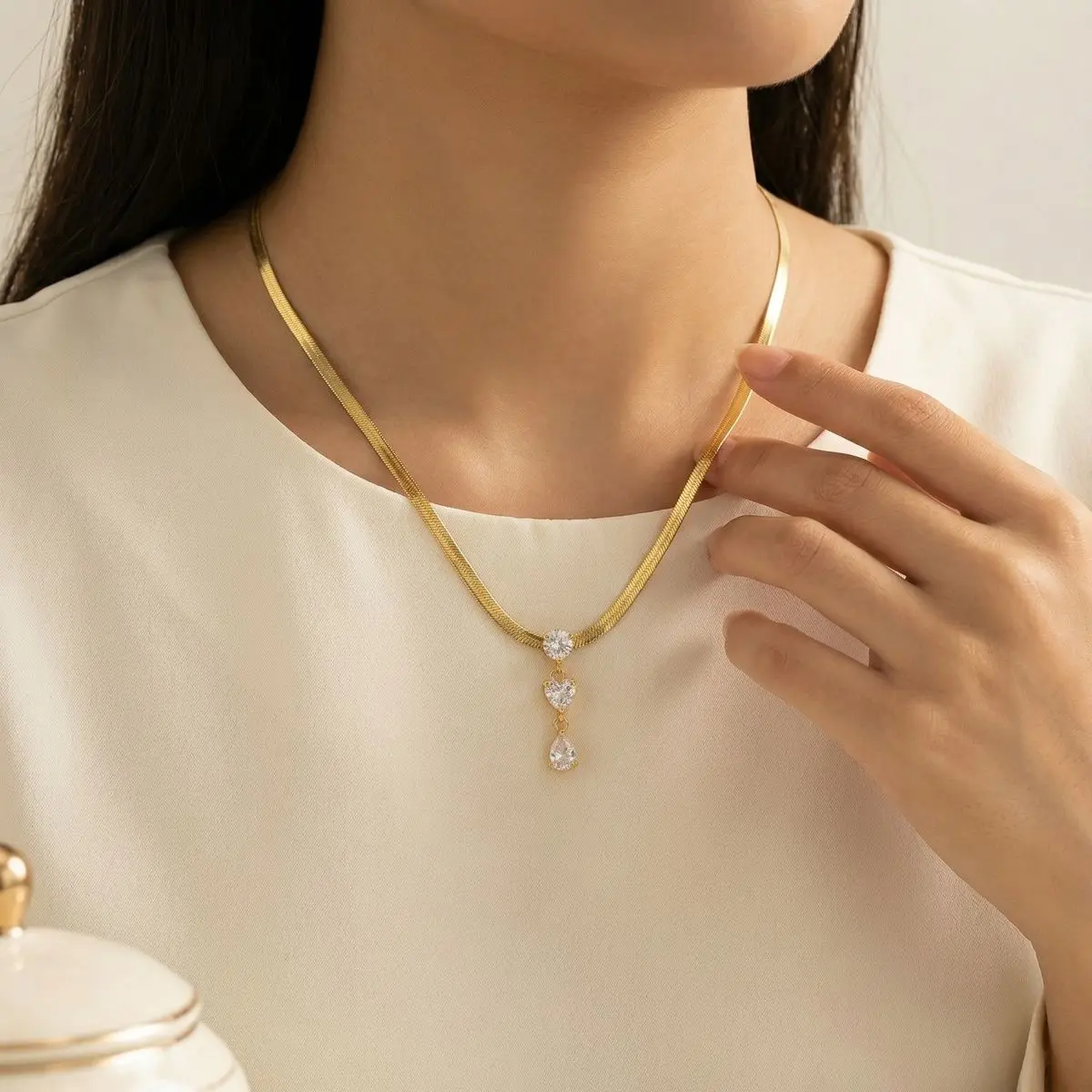 A modern herringbone chain necklace with a cascading pendant of three sparkling stones in round, heart, and teardrop cuts, creating a luminous, elegant focal point.