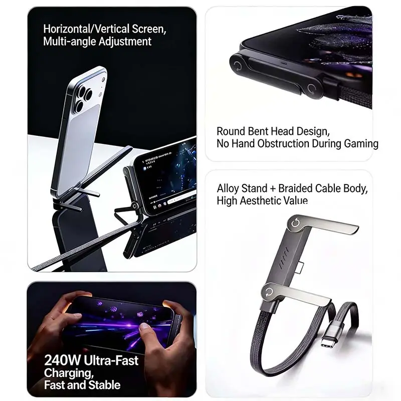 The Invisible Holder Charger Cable with Stand is a 240W super fast charging 2-in-1 Fast Charging Cord & Phone Stand. It's compatible with Type-C charging cables and is perfect for gaming, office, car travel. This versatile cable combines charging and stand functionality, making it ideal for various settings.