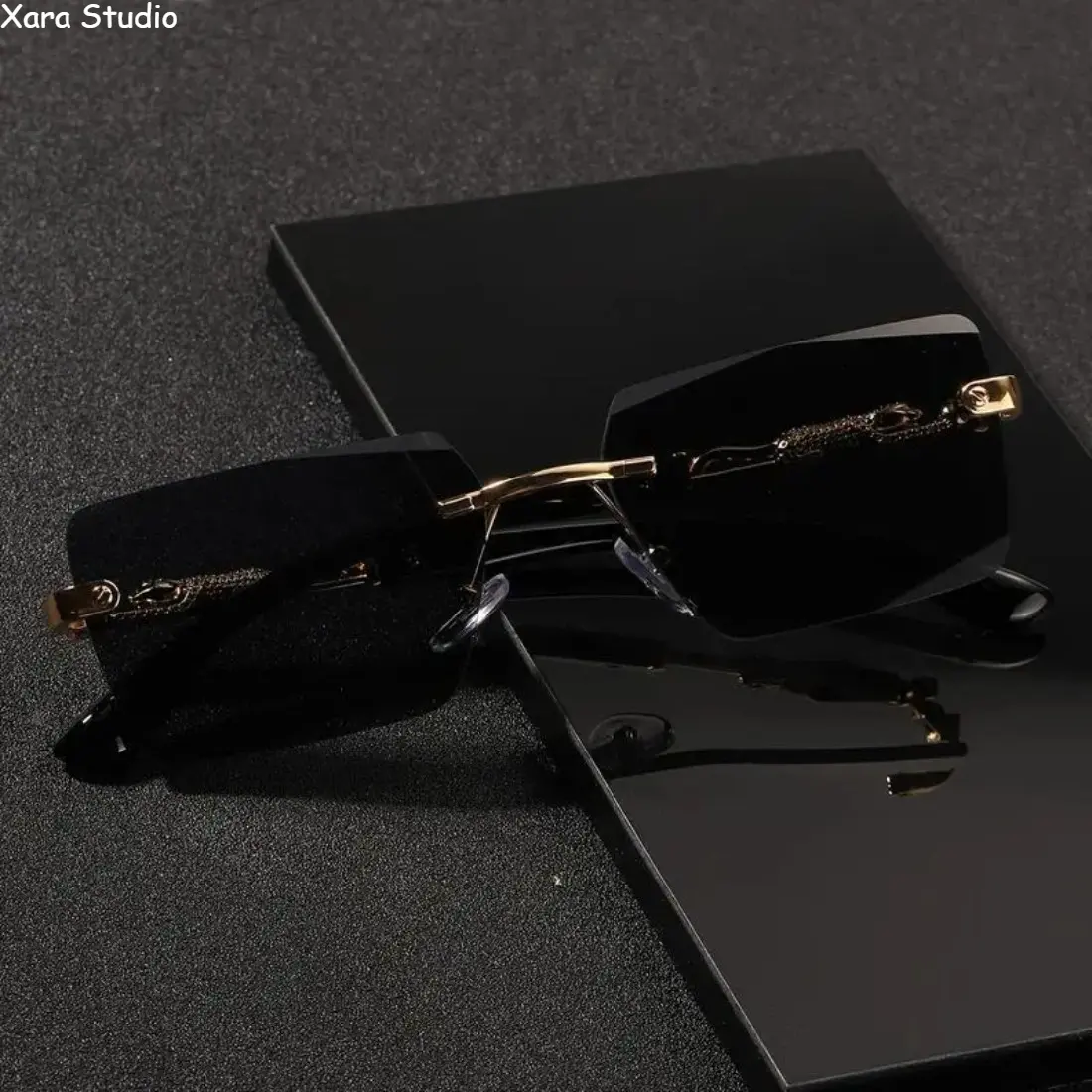 - Rimless rectangle frame with a clean, modern look