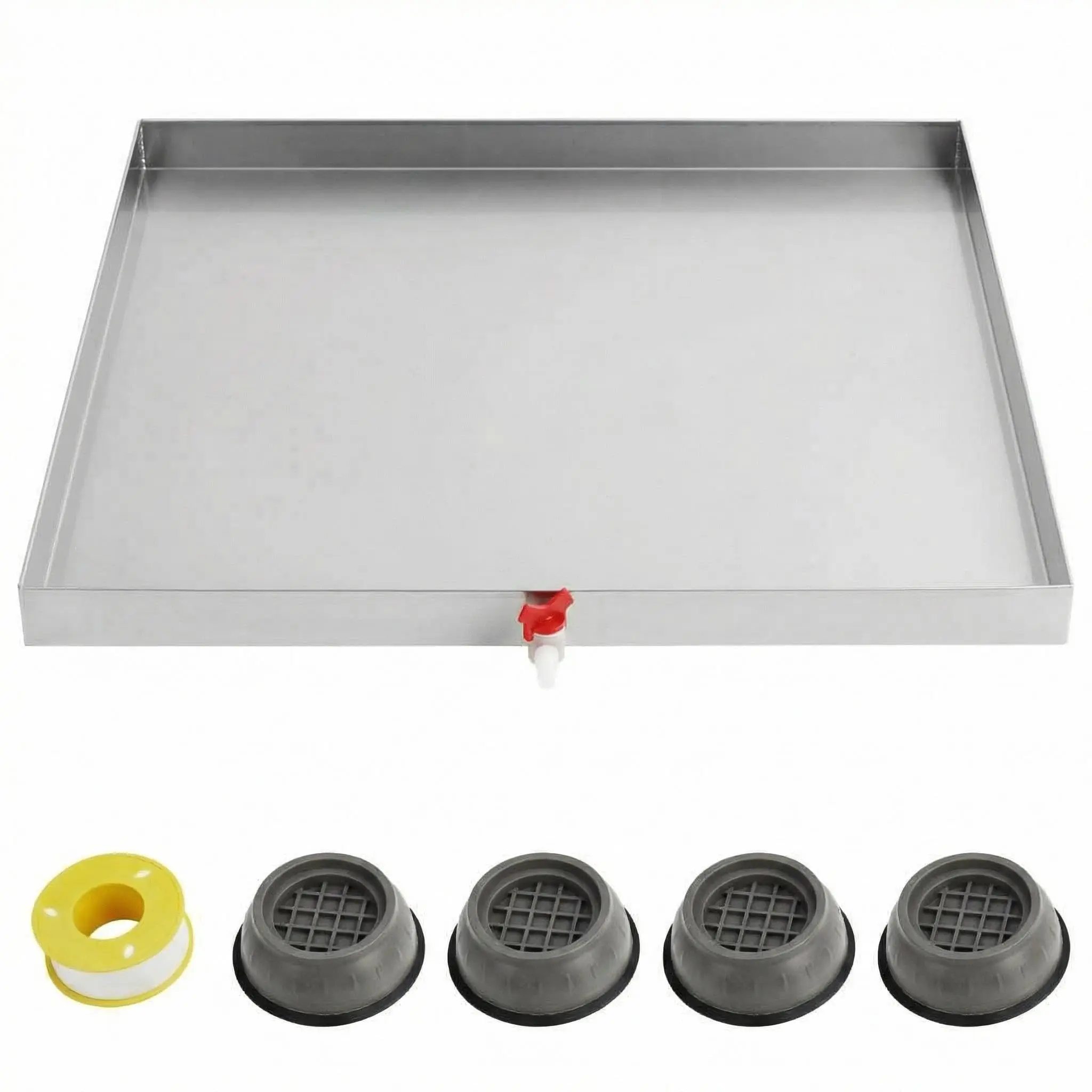 ·Heavy Duty Construction: Crafted from 0.75mm thick 201 stainless steel. this 28" x 30" drip pan with drain hole & hose adapte is built to handle heavy loads. Its robust design provides a durable. rust-resistant barrier against leaks and overflows from large appliances.