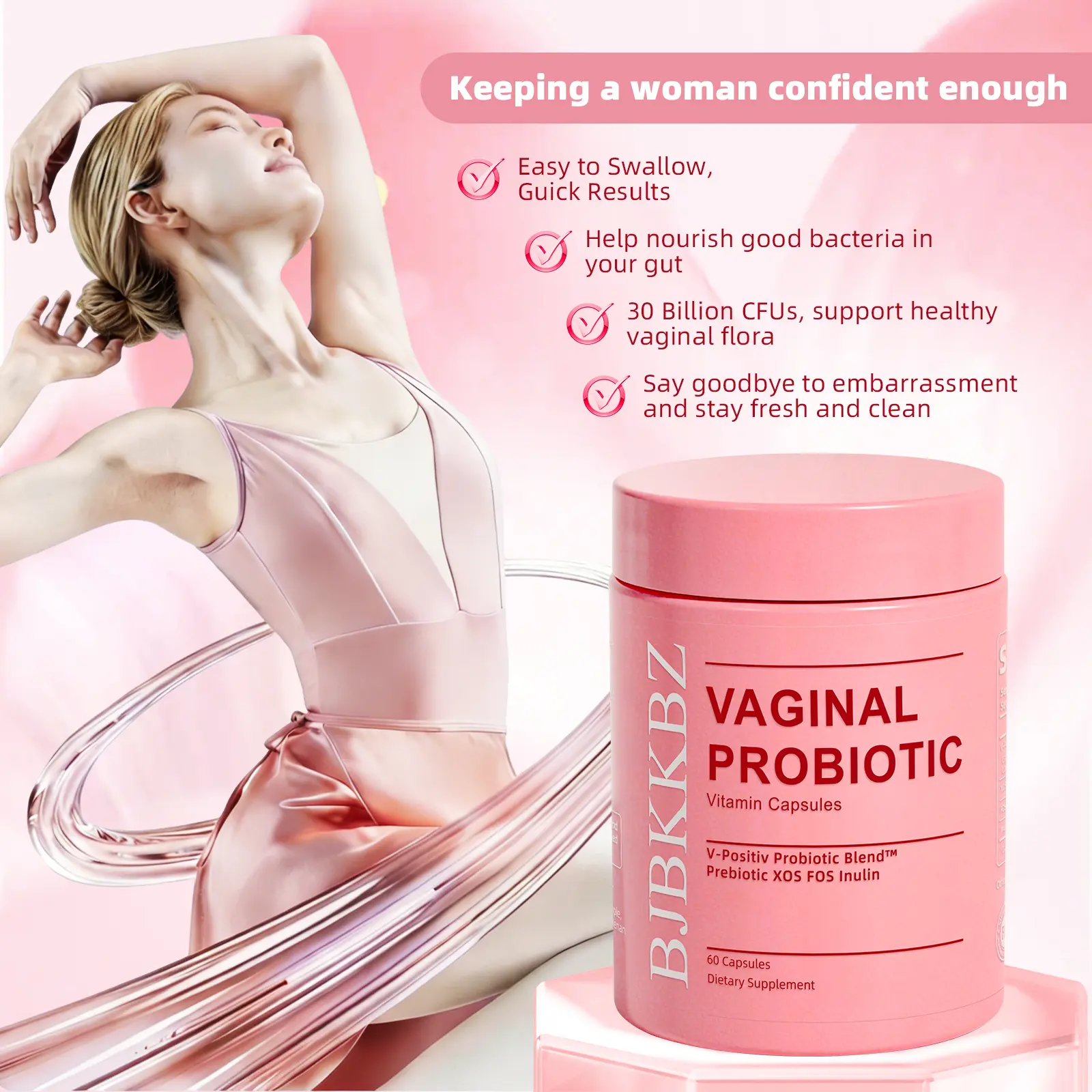BJBKKBZ Vaginal Probiotic Vitamin Capsules, V-Positiv Probiotic Blend with Prebiotic XOS FOS Inulin, Supports Vaginal pH Balance, Yeast Balance & Urinary Tract Health, 60 Count Dietary Supplement